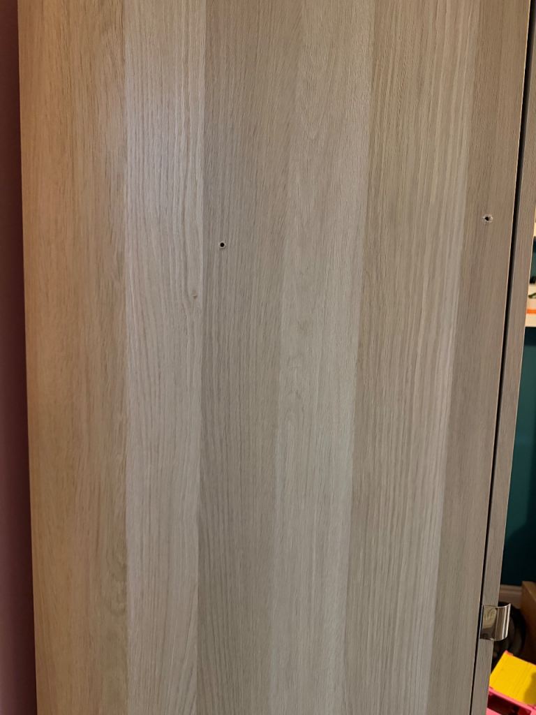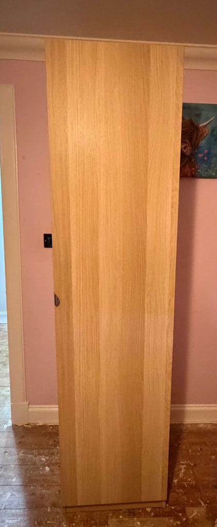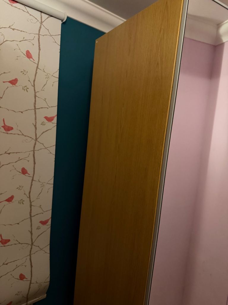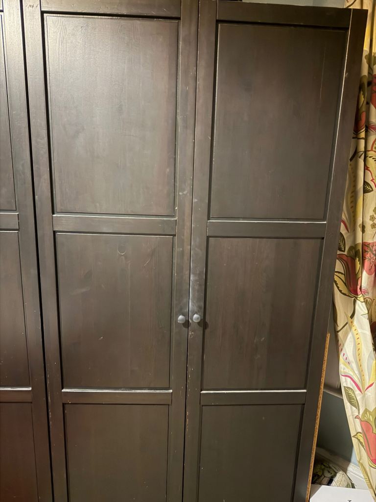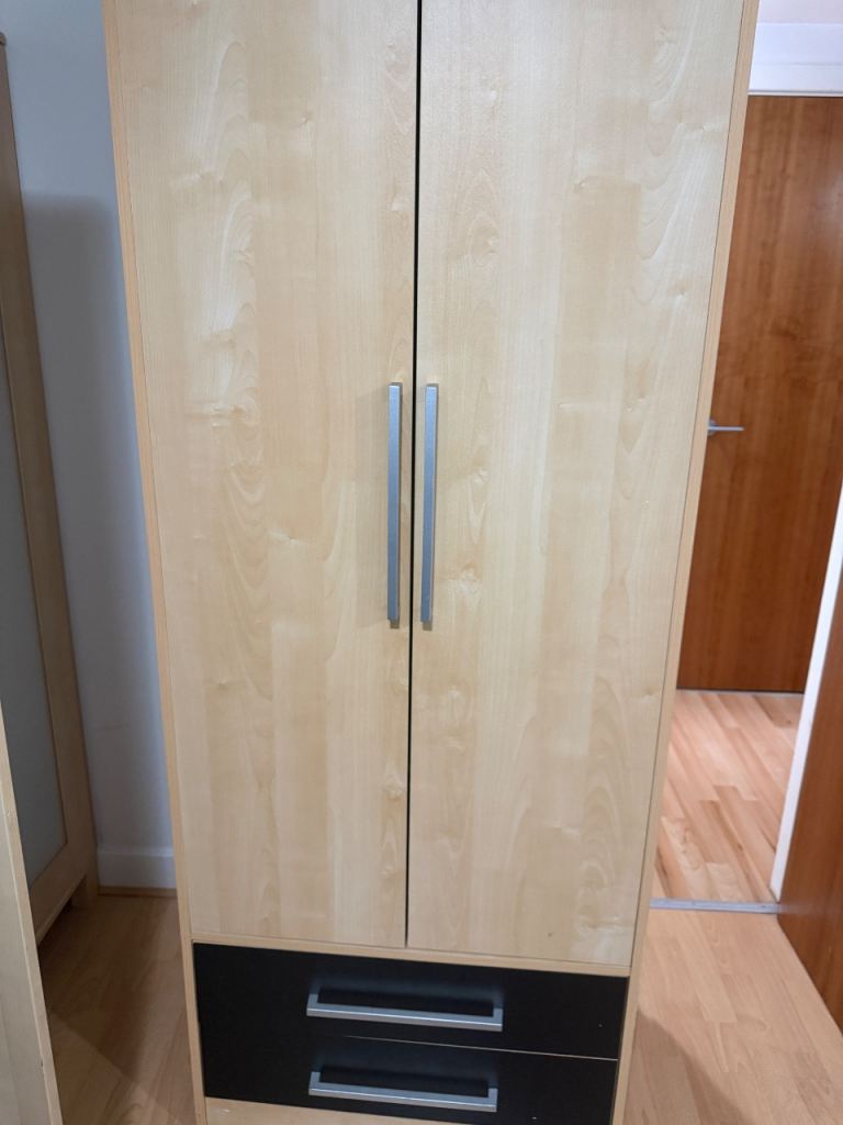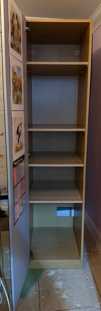 3 Ikea wardrobes in good used condition with shelves and drawers. Two wardrobes have mirrored doors (colour - oak), third is wood veneer door (colour - white oak). We had them attached together but can be sold as single units.