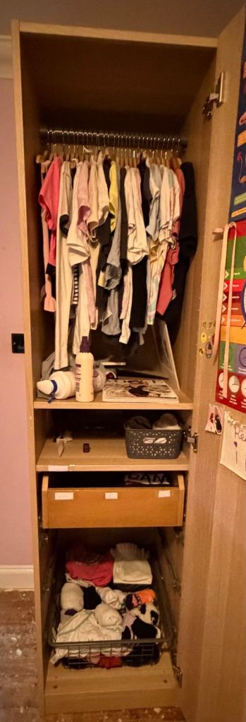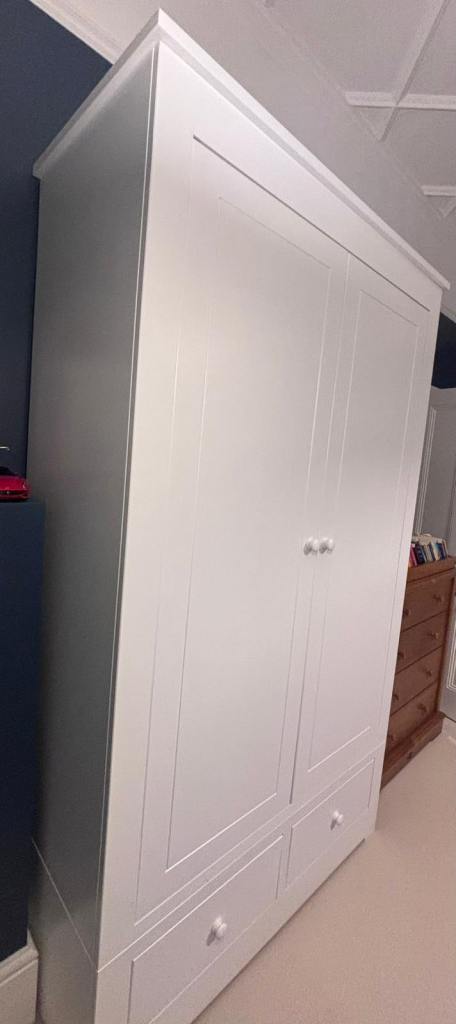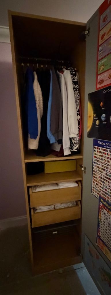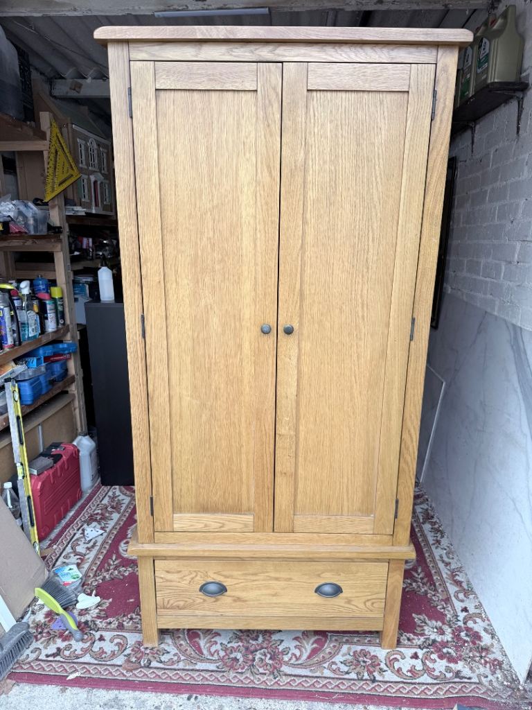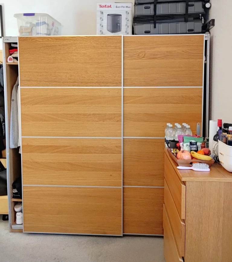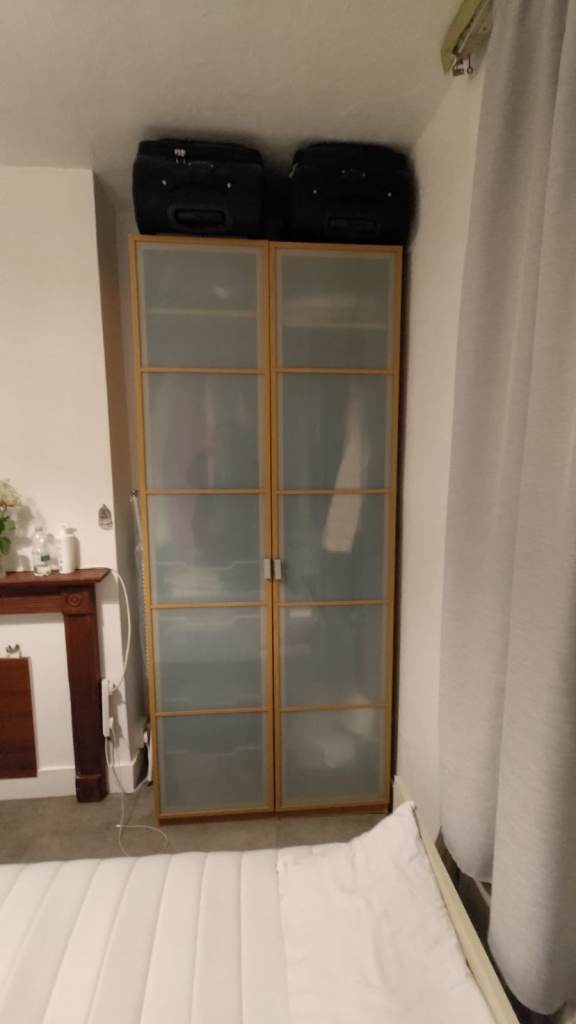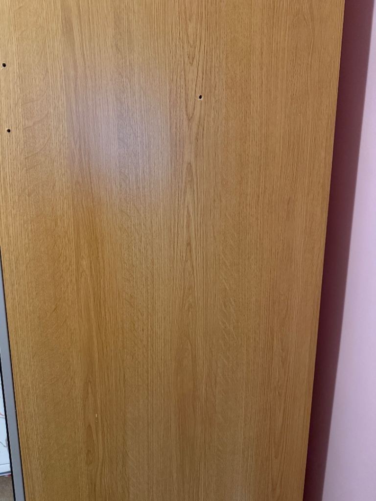 3 Ikea wardrobes in good used condition with shelves and drawers. Two wardrobes have mirrored doors (colour - oak), third is wood veneer door (colour - white oak). We had them attached together but can be sold as single units.
