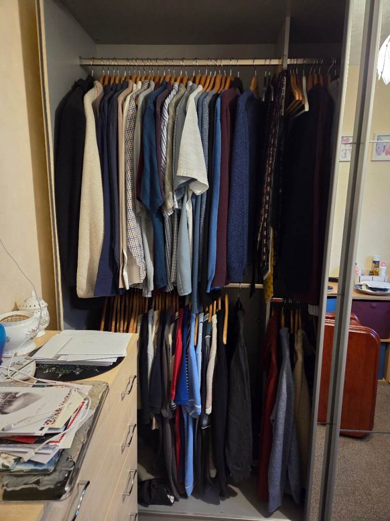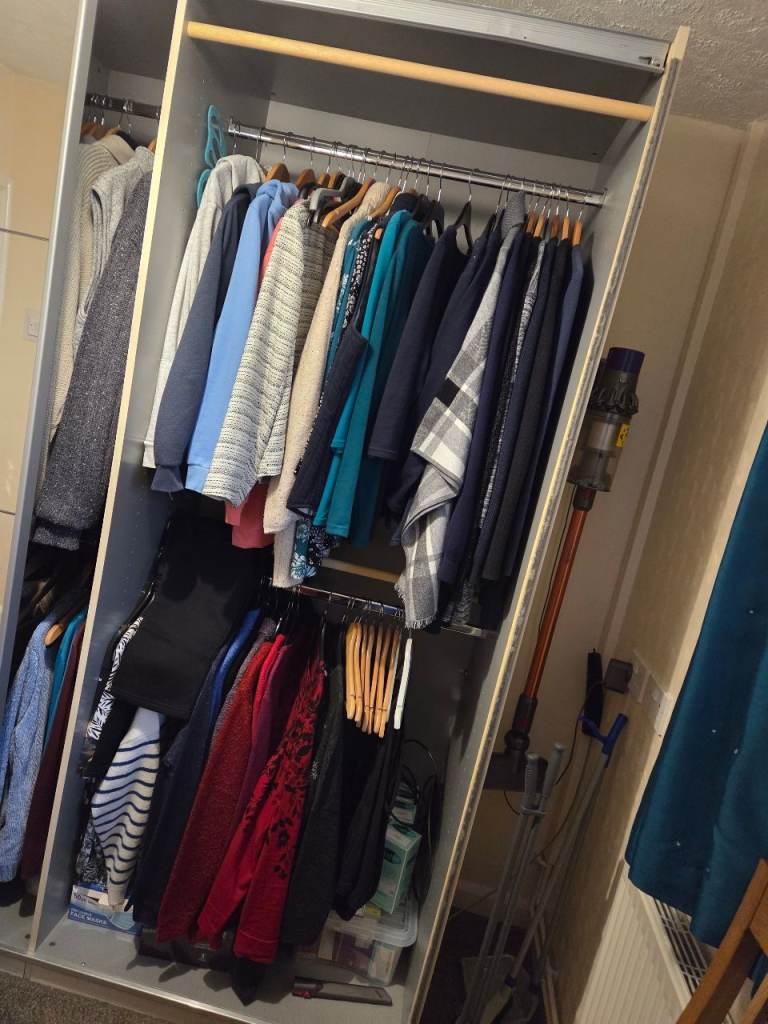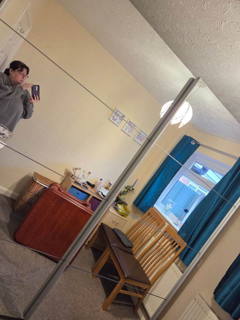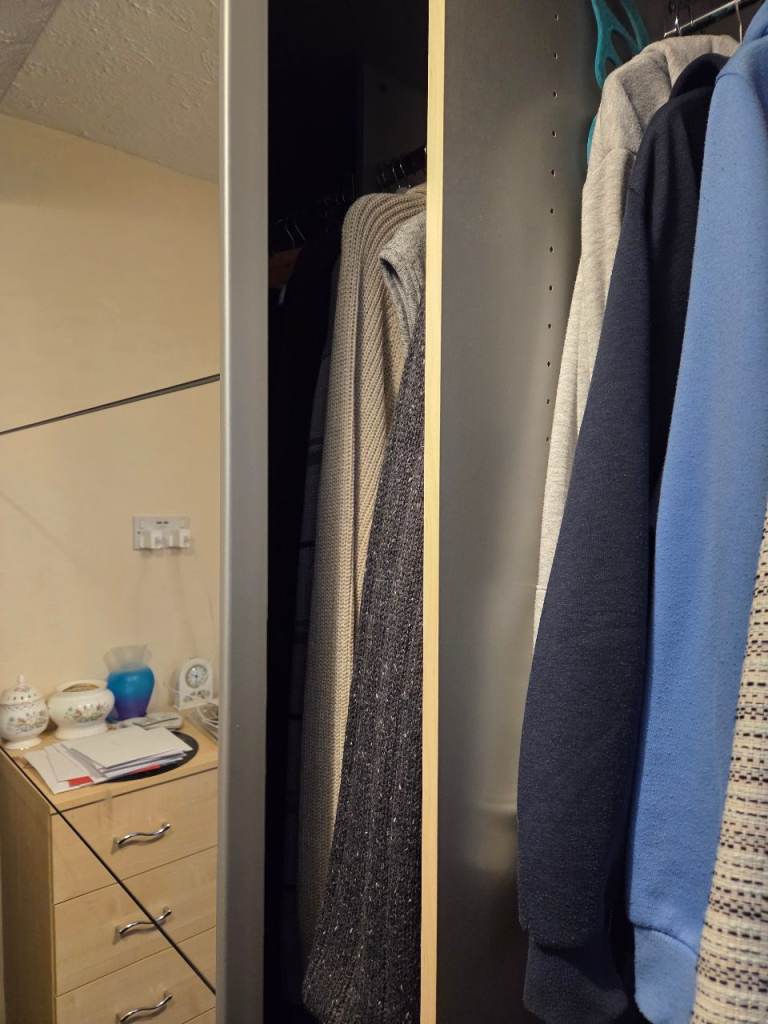 Large wardrobe with mirrored sliding doors. In excellent condition. Will be dismantled and ready for collection after Christmas. 90" width x 87" height x 27" depth. 3 sections within, two larger sections on either side and then a smaller section in the middle. Contents not included. Buyer to collect from Trinity Fields in Stafford near J14 of the M6