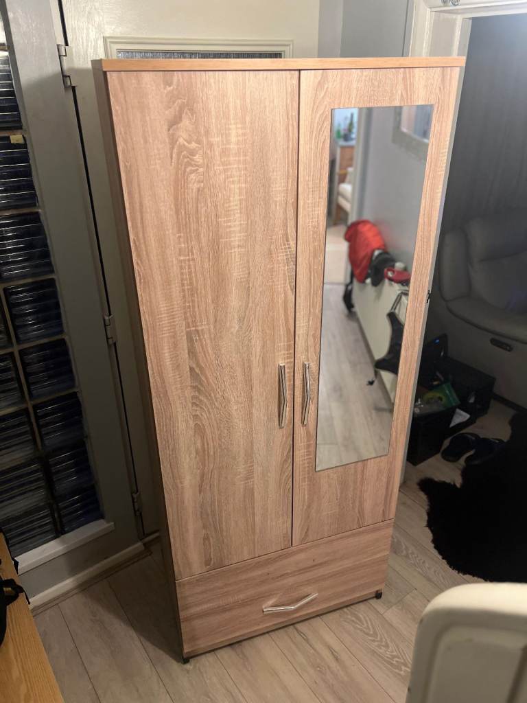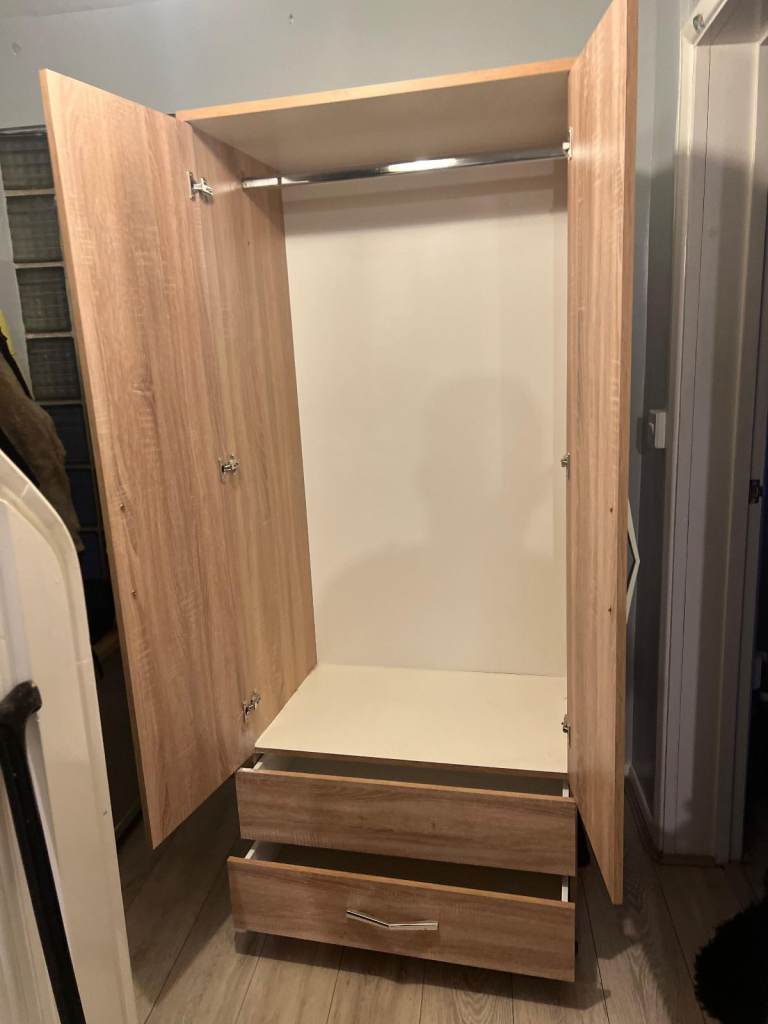 I'm selling a modern, stylish double wardrobe in a light oak-effect wood grain finish. This wardrobe is in excellent/nearly new condition and is perfect for a bedroom, spare room, or guest room.