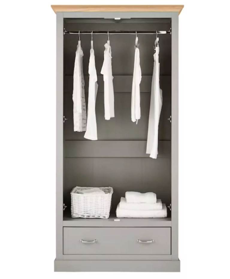 Ashford 2 Door 1 Drawer Wardrobe Finished in Grey/Oak Brand New in Box, Oak-effect tops contrasted by the wood-effect frame and chunky plinth. Drawers sat on easy-glide runners with metal handles. Features a full length hanging rail. H.192 x W.95 x D.57cm