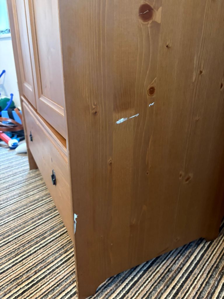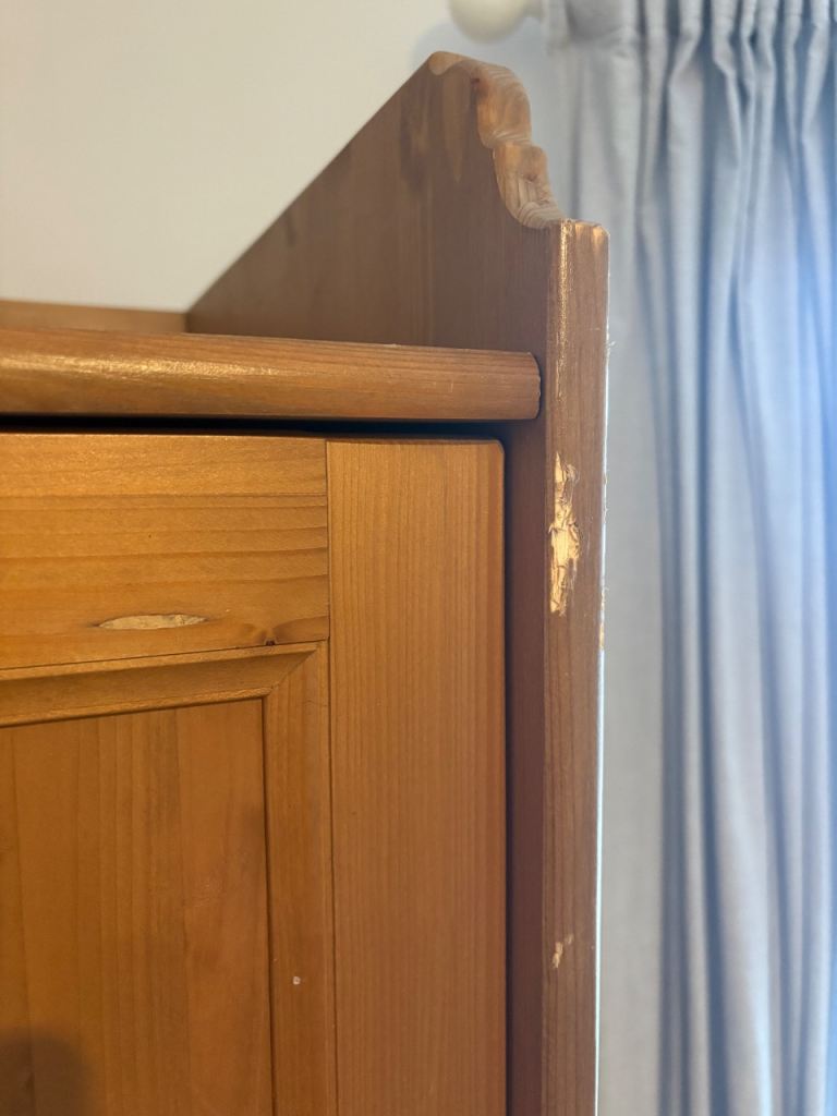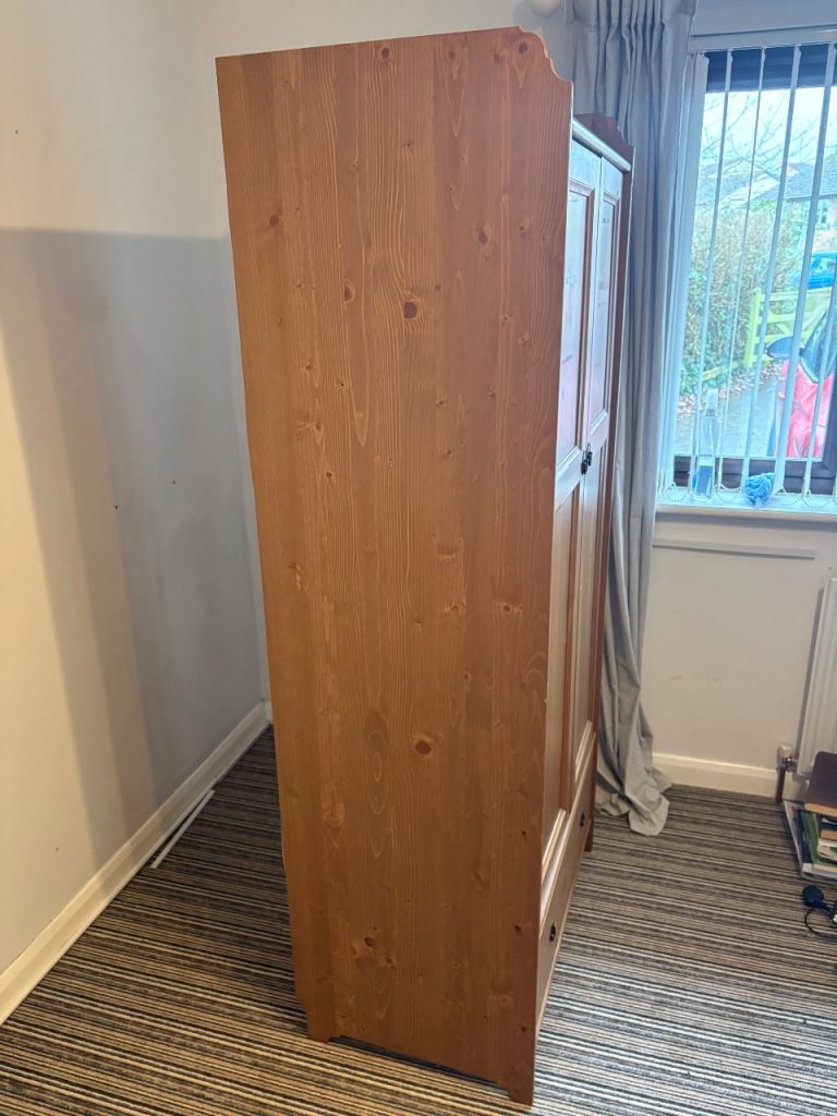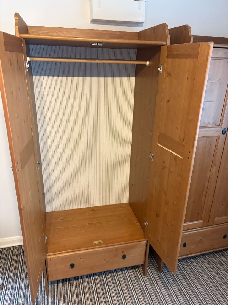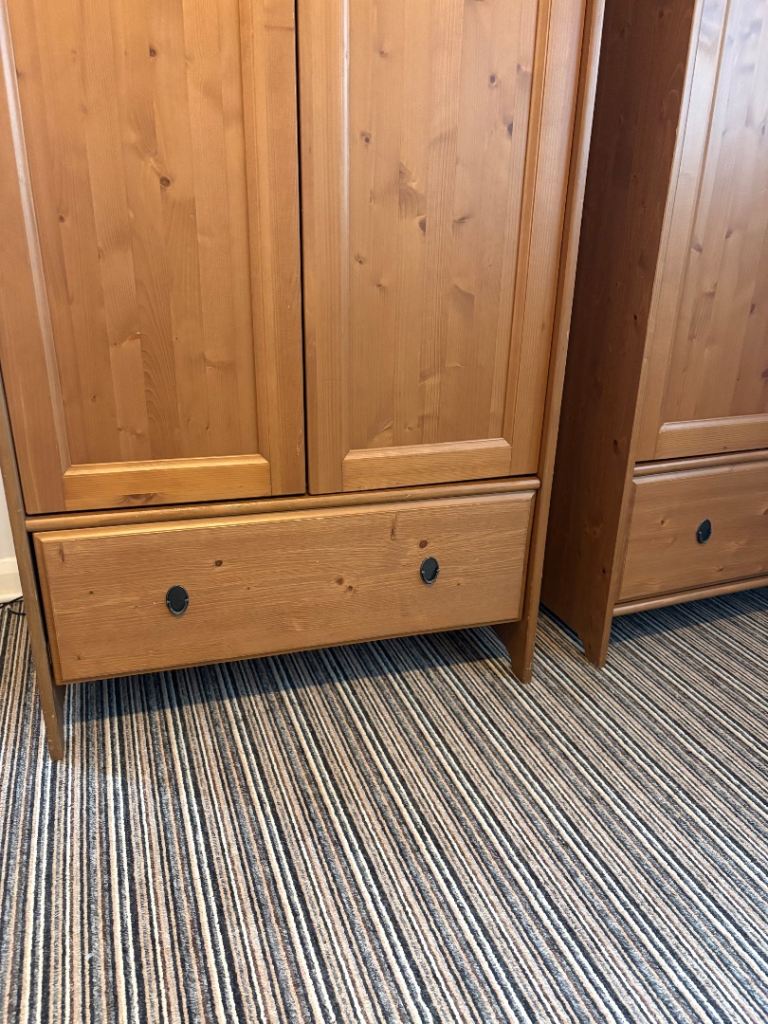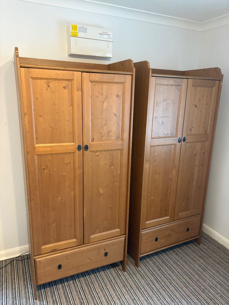 Pair of nice pine wardrobes. Lots of storage space. Some minor damage pictured. 1st wardrobe - scuff top right corner. 2nd wardrobe - missing internal shelf, piece of wood below drawer (non-structural) and small white paint mark on side.