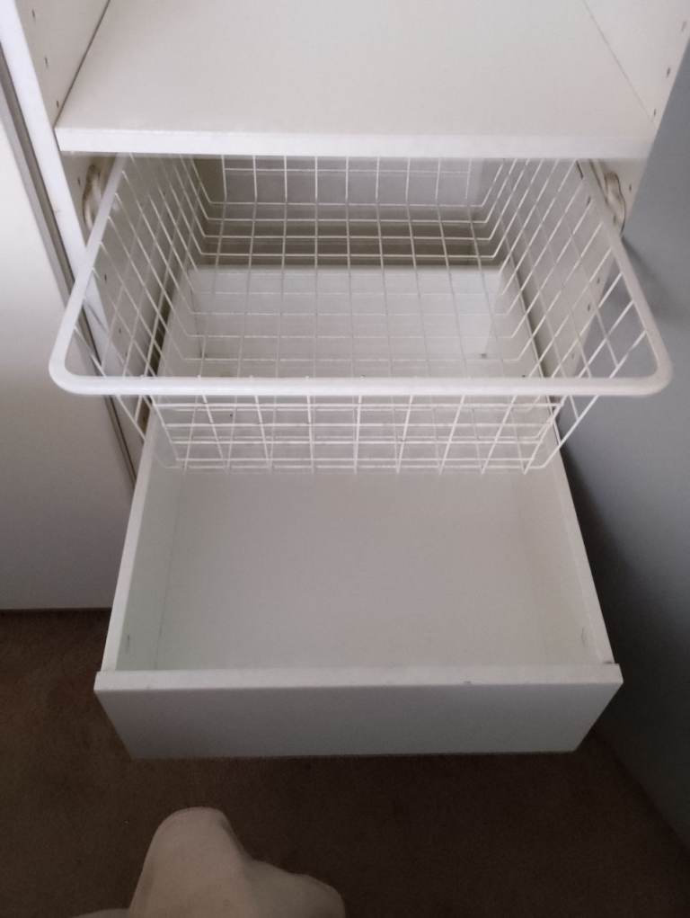 In very nice condition . Has sliding drawer and basket . Also has height adjustable shelf and hanger bar