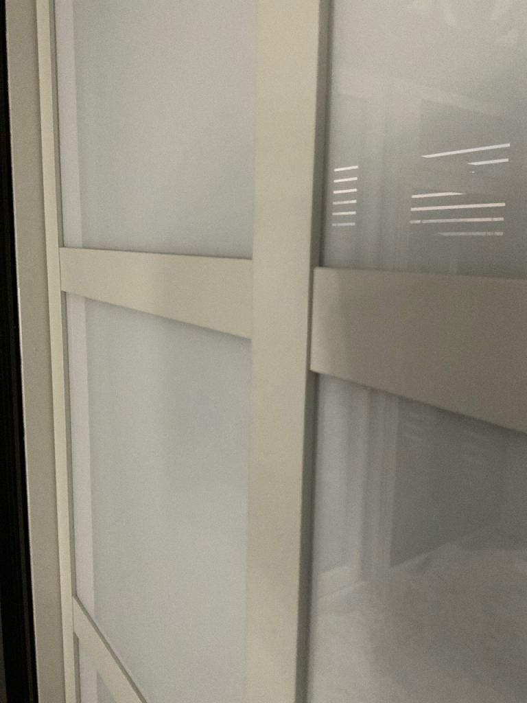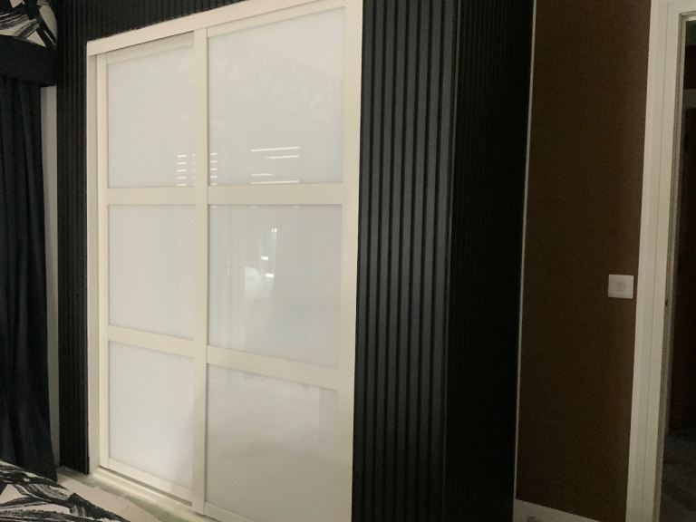 Excellent condition white sliding wardrobe doors, insets are white glass.