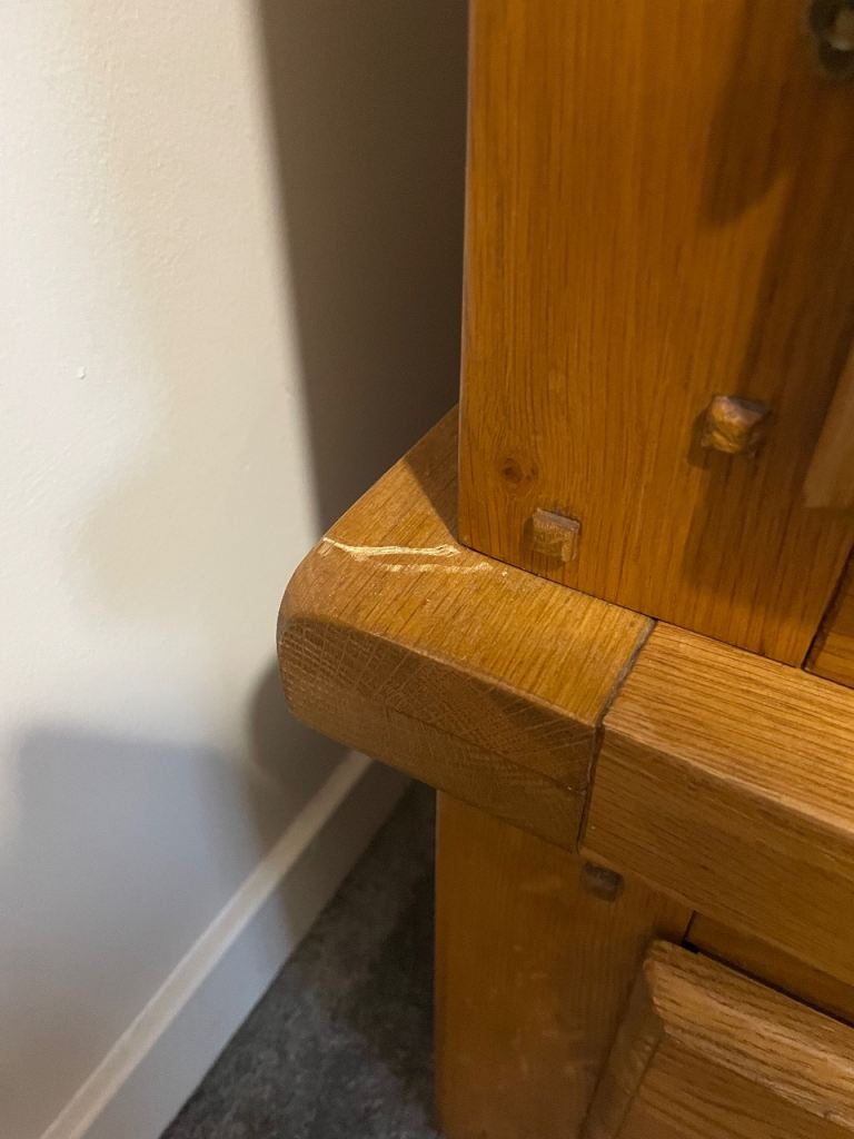 Please see images. Scratch in one corner and chip on one of the feet which does not effect use at all.