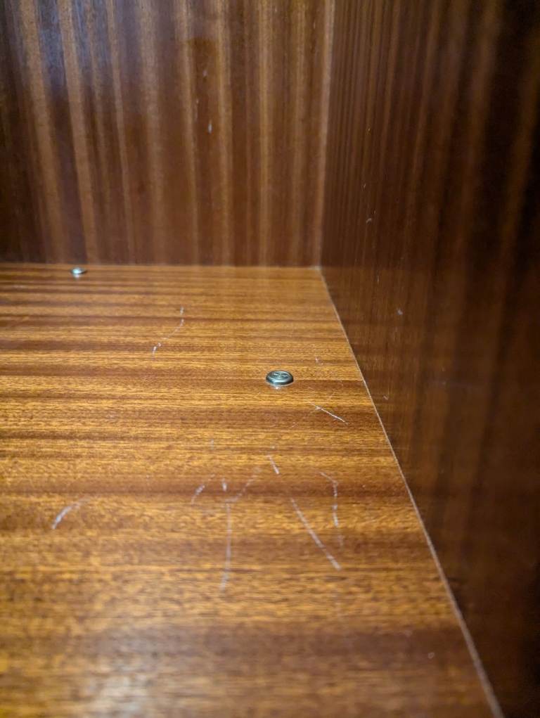 There are some light scratches and signs of wear, which I’ve tried to show clearly in the photos. One side has a hanging rail; the other has four shelves and two drawers. Original feet.