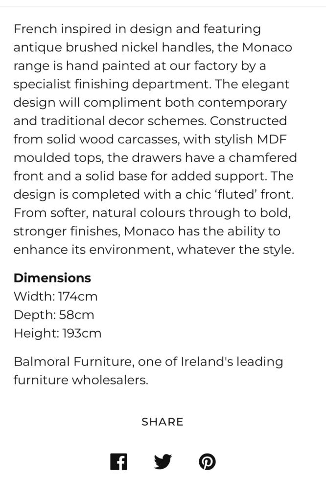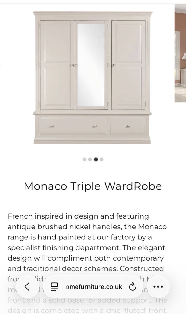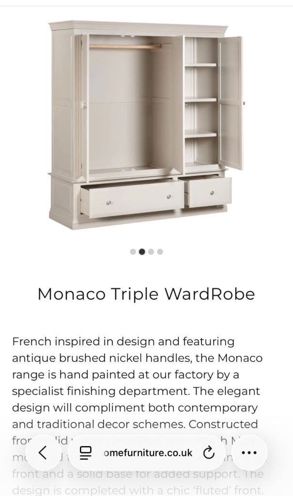 Beautiful triple wardrobe from Monaco range. Excellent condition, only a few years old. Only selling due to house move. Over £100O new so chance to get a real bargain. Matching double chest of drawers available too. Colour: Farrow and Ball Elephant’s Breath. Beautiful neutral tone. £250 or best offer