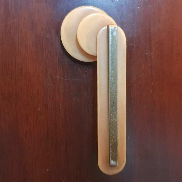 It has gorgeous wood grain throughout, and cute bakelite and metal handles.