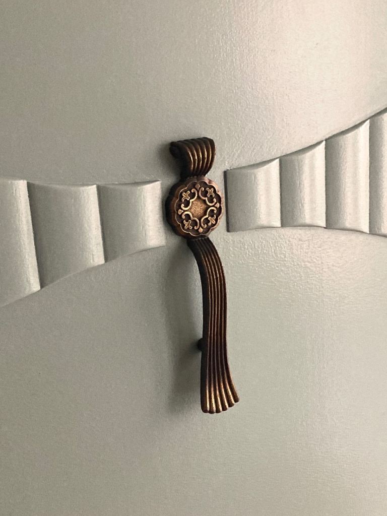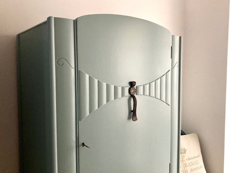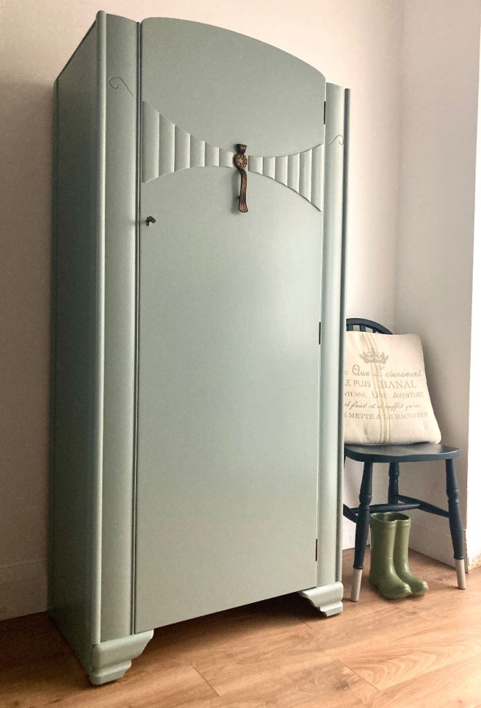 This vintage Art Deco gentleman’s wardrobe by Lebus has been restored and finished in durable satin paint in a soft light green/sage tone.