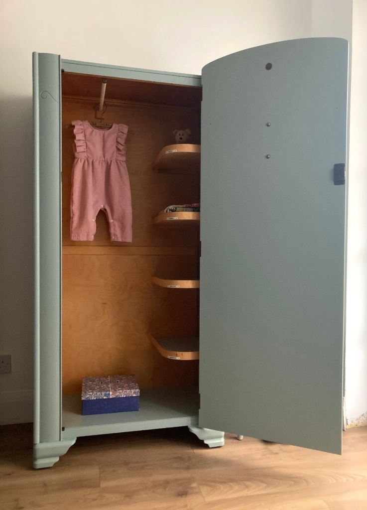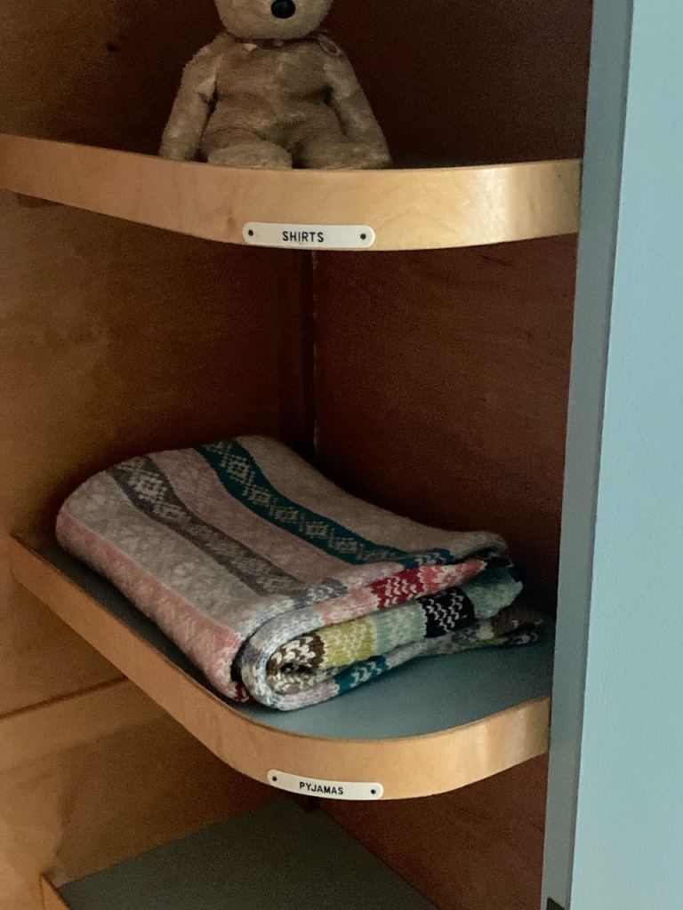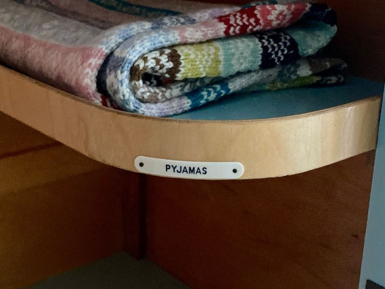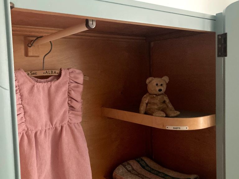 The interior is divided into two practical sections. The left side features a hanging rail, while the right side has four original shelves with charming labelled tags: shirts, pyjamas, woollens, and underwear.