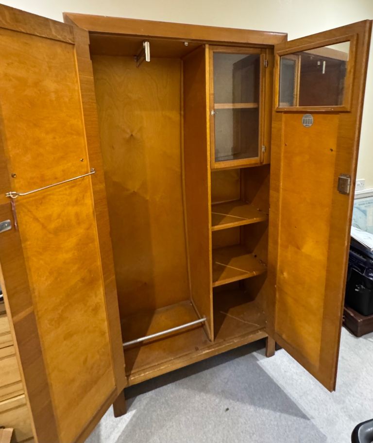 1950’s Vintage wardrobe, light wood, with lovely internal glass fronted cupboard and mirror.