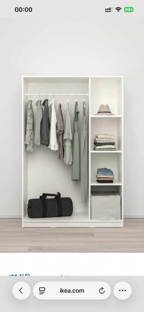 It is a new wardrobe with 3 doors- ikea brand. The clothes rail holds about 20 shirts on hangers. One shelf holds about 10 pairs of folded trousers or 20 t-shirts. Size is 176x55x117 cm.