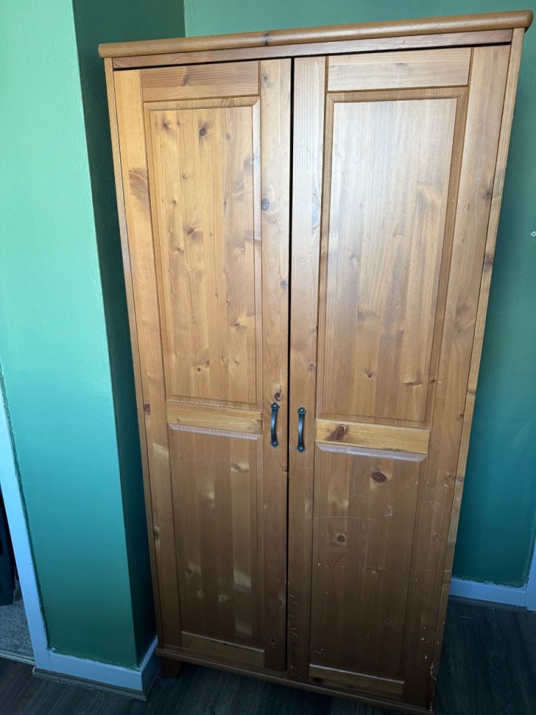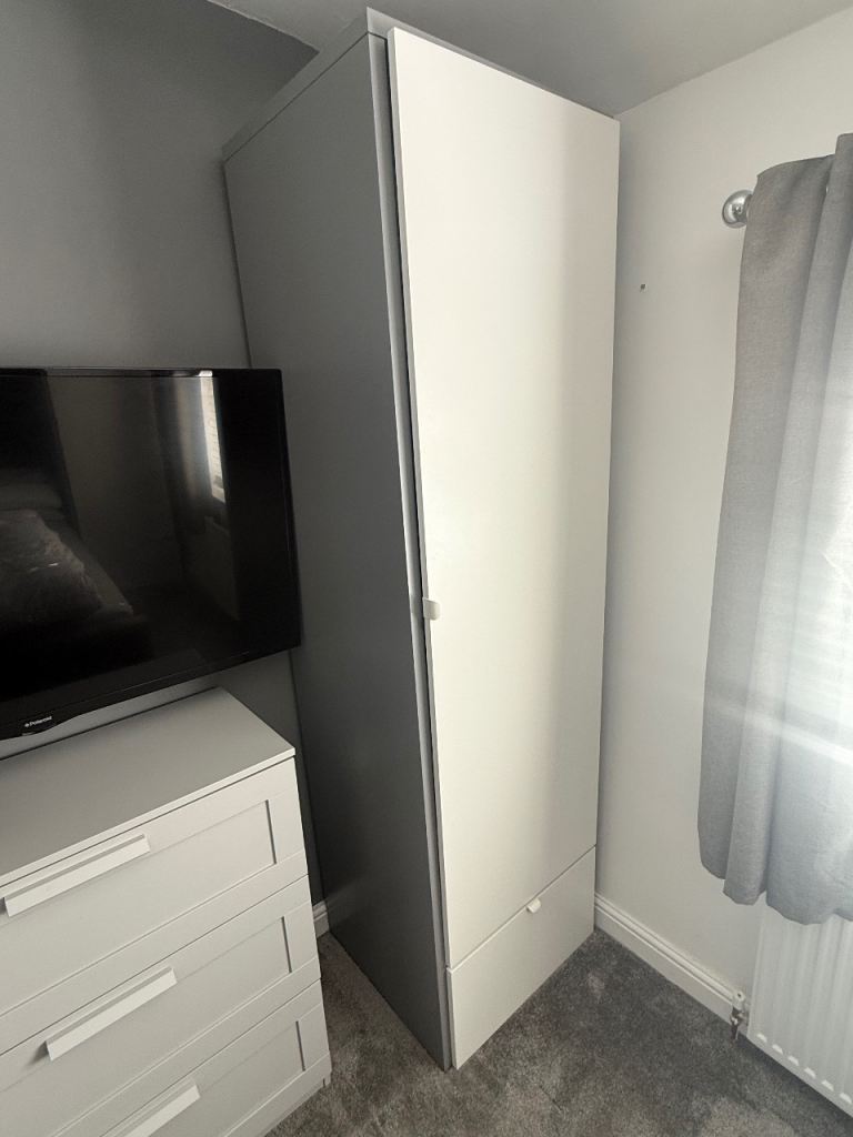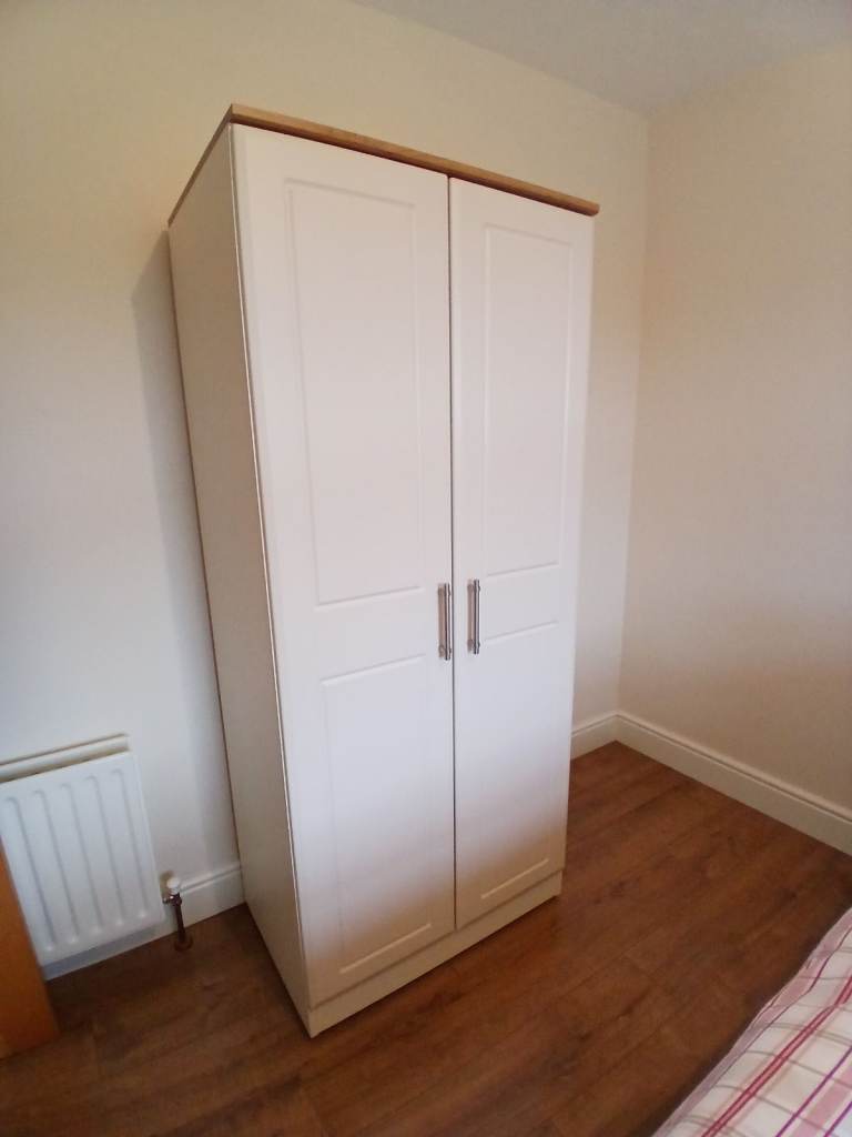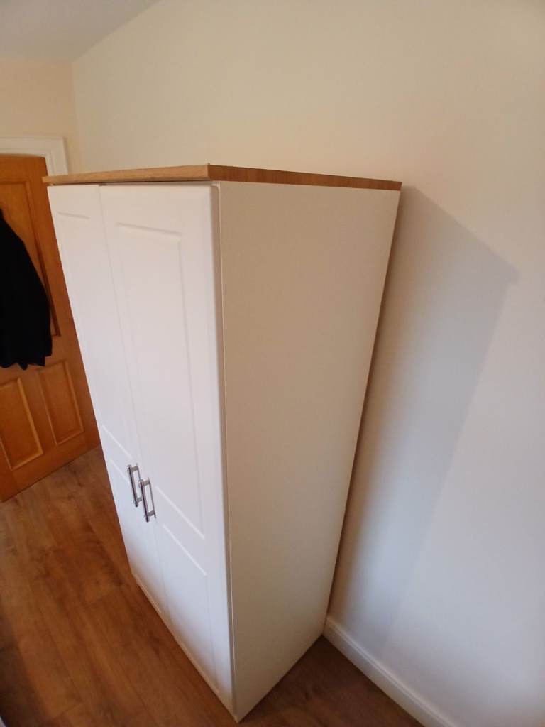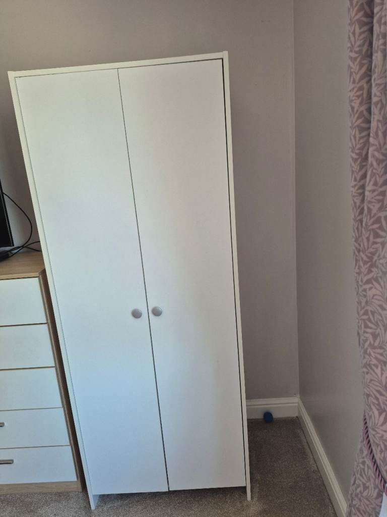 Mint condition wardrobe with upper inner shelf and clothes rail. Item is off white/ cream in colour and is about 73" tall, 21" deep and 32" wide. Also have matching chest of drawers for sale. For collection only please.