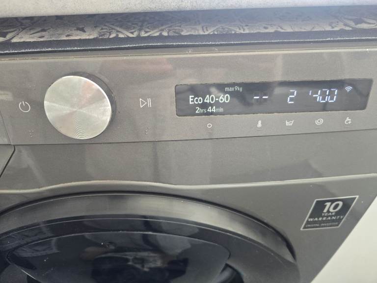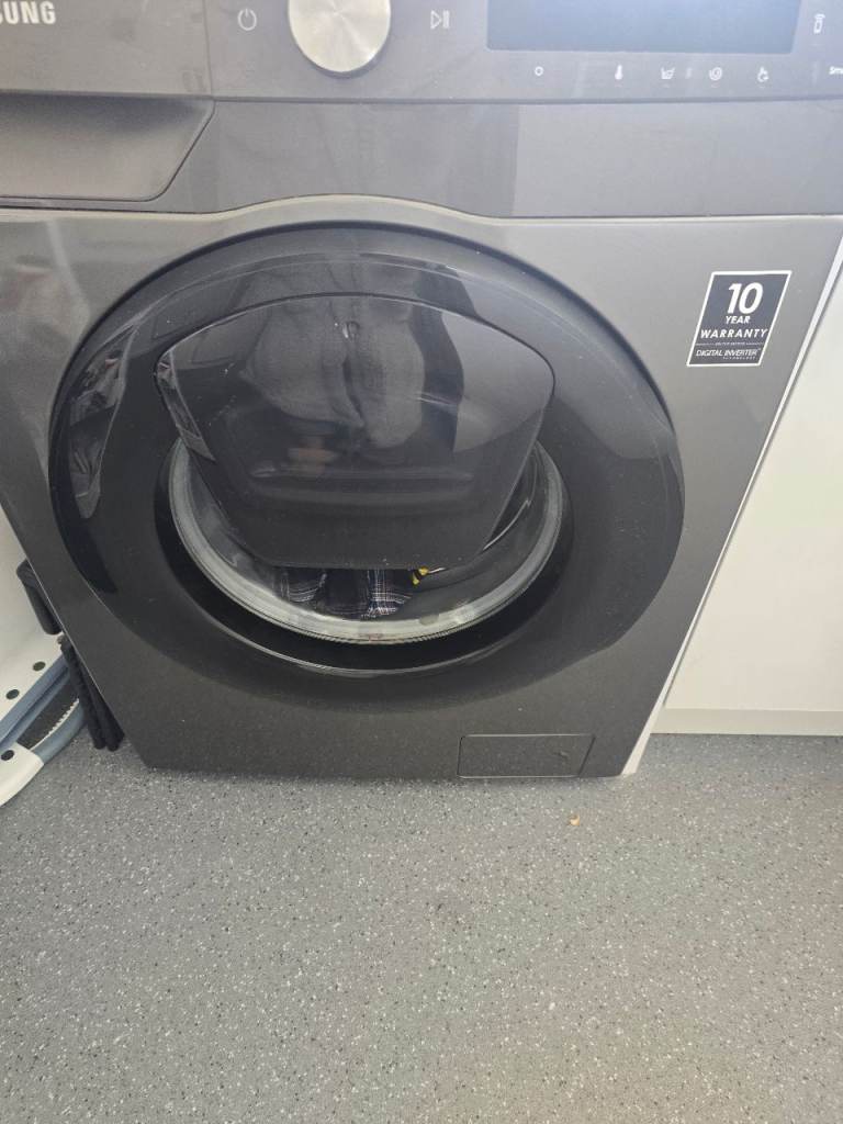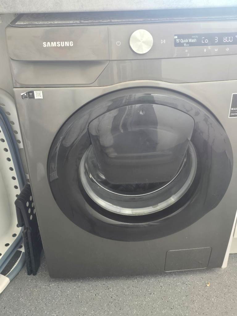 Samsung washing machine good working condition the only problem is the door seal has a chunk out of it so if you do a long wash it seems to leak water but if you do a quick wash it doesn't the seal can be replaced apart from that machine is excellent condition and you can connect your phone to it 8kg load ecobubble also you can add washing to it if you come across something you missed as door has an opening hatch on it graphite in colour pick up only