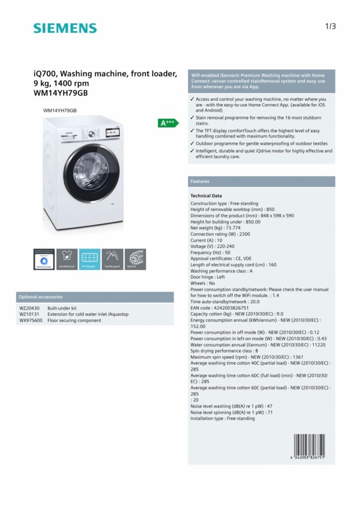 Posting for 5+ yearsSiemens iQ700, 9 kg Washing Machine
