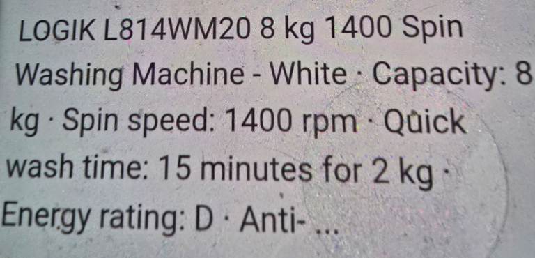 Selling washing machine as moving to new home in the next few days and too big for the space that is there, this is approximately 12 months old great condition capacity and spin speed in pictures