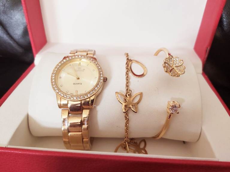 Brand new ladies watch gift set comprising of a charm bracelet, gold bangle diamond encrusted and a gold watch with diamonds on the face.