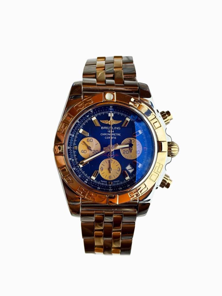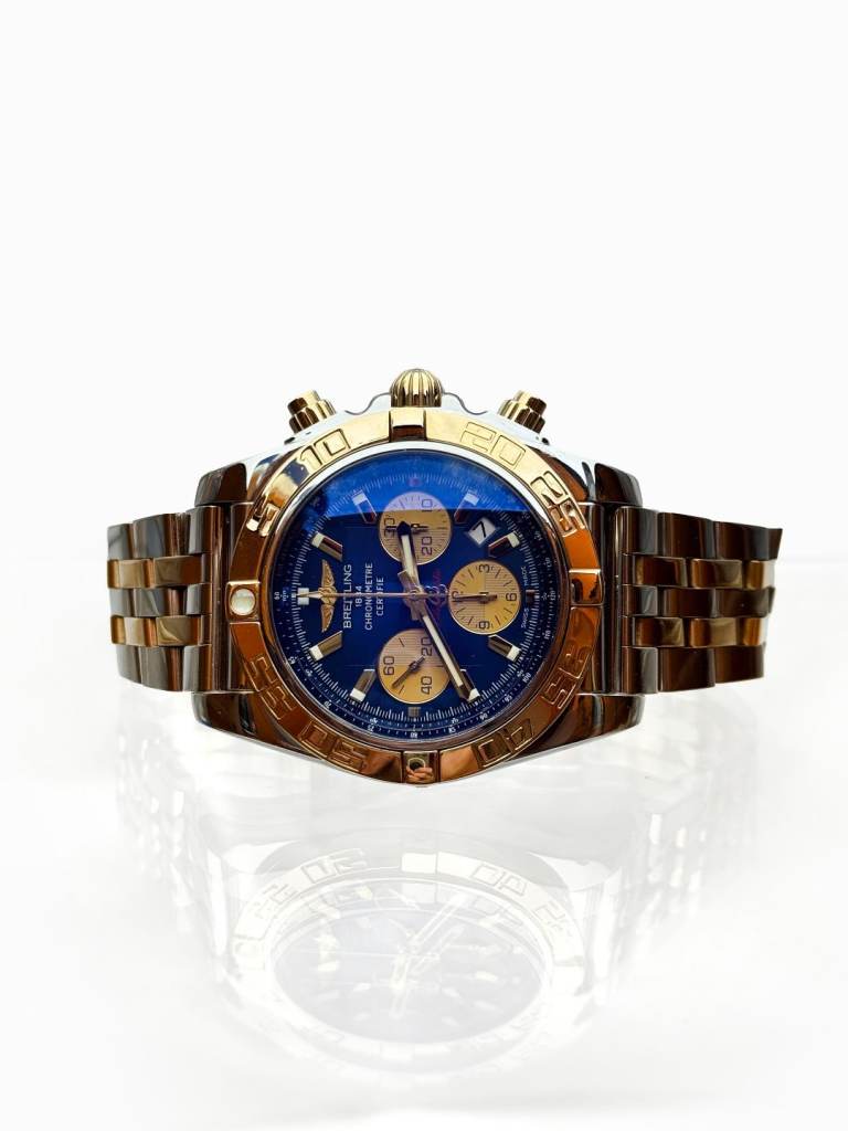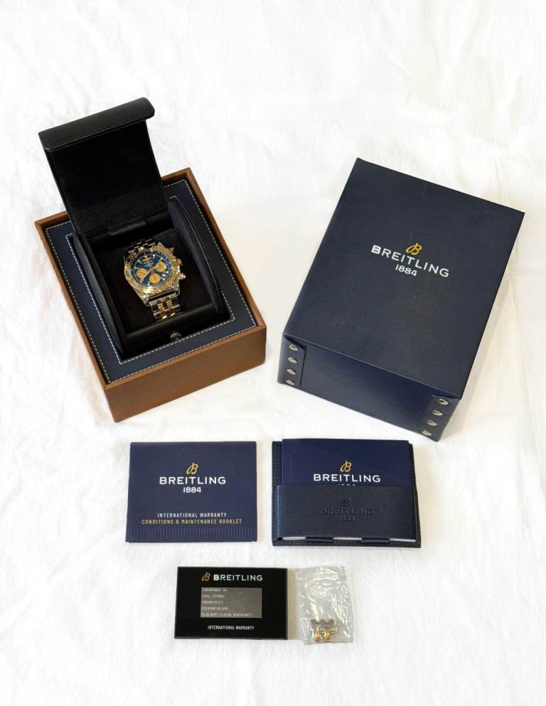 Breitling chronomat44,mint condition with box and all papers. 2019 model purchased from Goldsmiths. Blue face and gold subdials