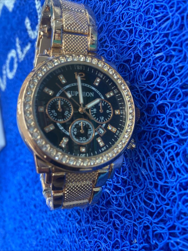 This fancy stylish rose gold coloured women's wristwatch features a quartz movement and a polished gold case with a rose gold strap and dial. The round watch shape has a 12-hour dial display and analogue display. Manufactured in the current year, this timepiece is a perfect accessory for any woman looking to add a touch of elegance to her outfit. With no customisation or vintage appeal, this wristwatch is a timeless piece that exudes sophistication and class.