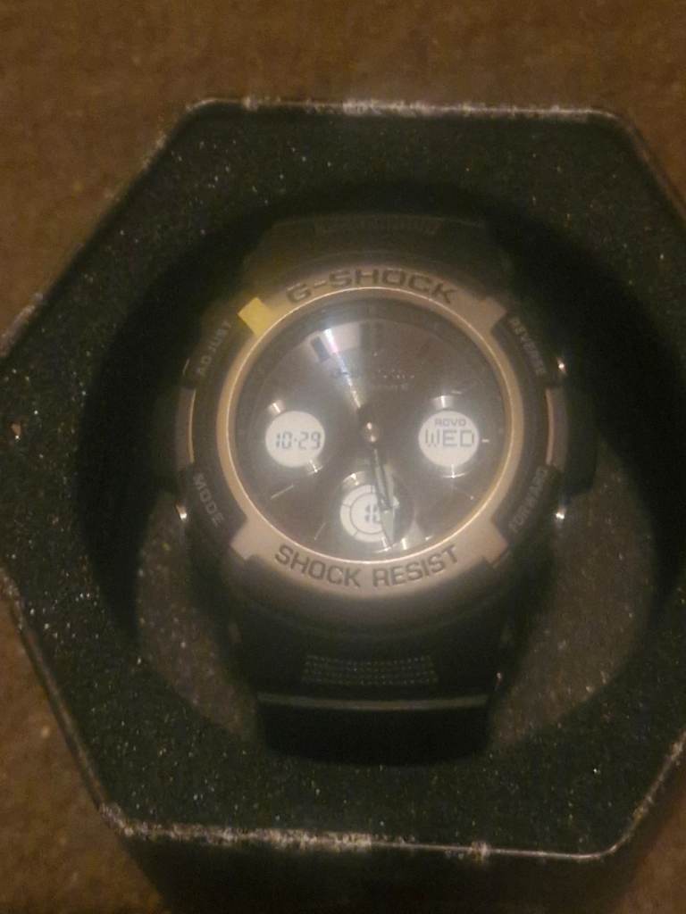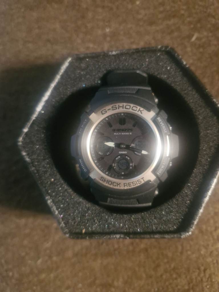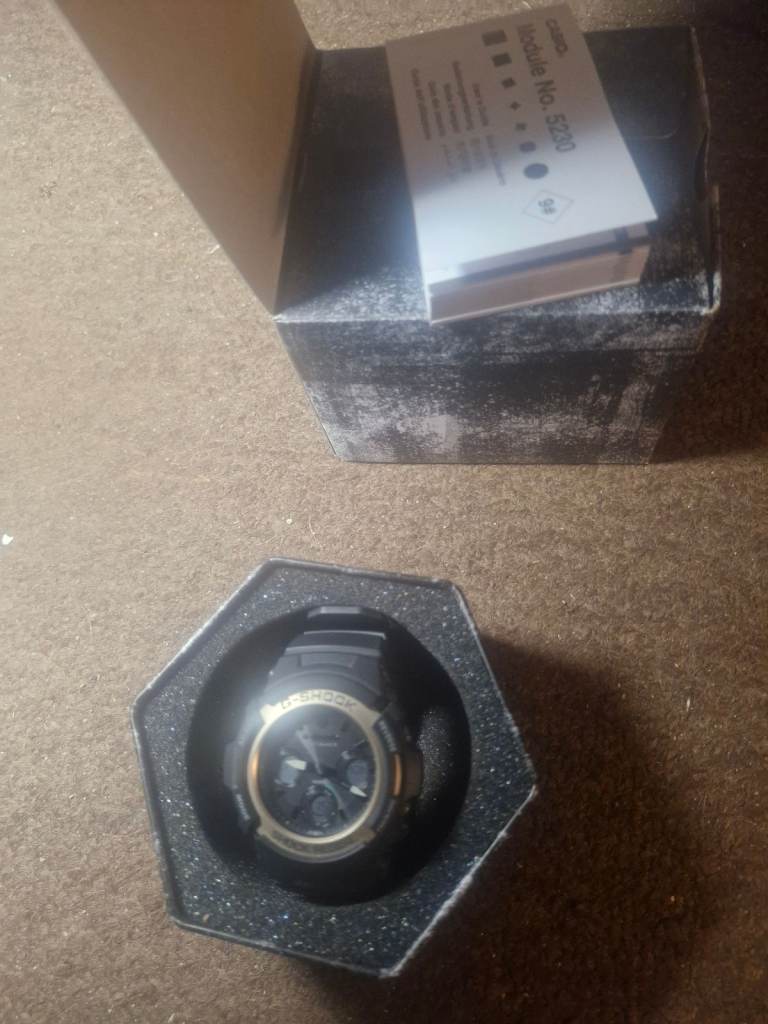 This sleek Fire Package AWG G-SHOCK watch from Casio features radio controlled timekeeping accuracy and tough solar power operation. Cramming precision technology into a compact case size without compromising on classic G-Shock durability, the 52 x 46 x 15mm gold tone and black case give the timepiece a special look which is finished with a black resin strap. 200m water resistant.