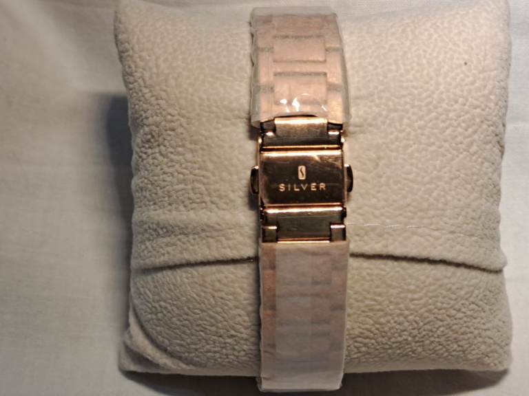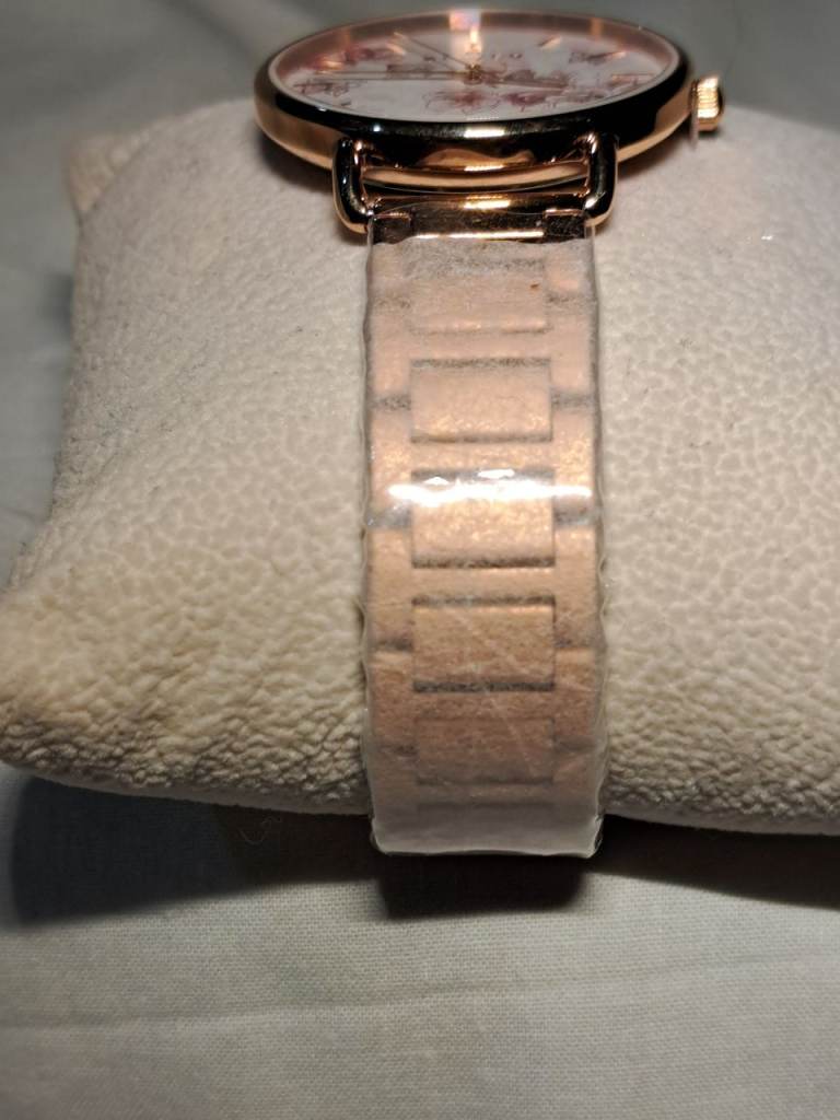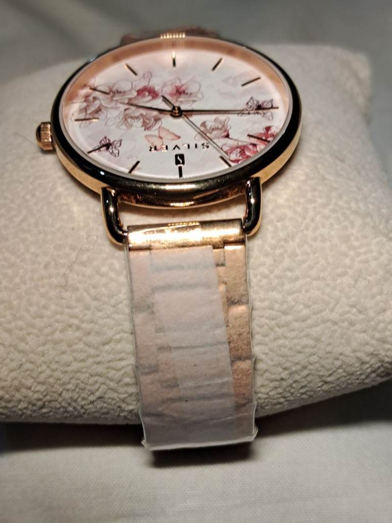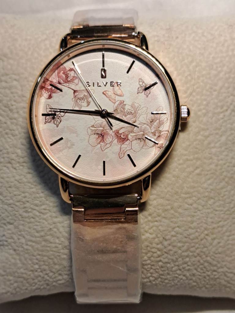 Elegant rose gold effect, slim profile, ladies watch with delicate flowers and butterflies in the watch face. Strap length 19.5cm, with fold over clasp.