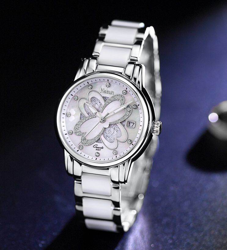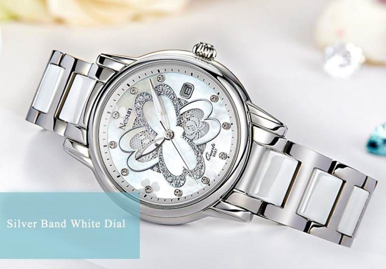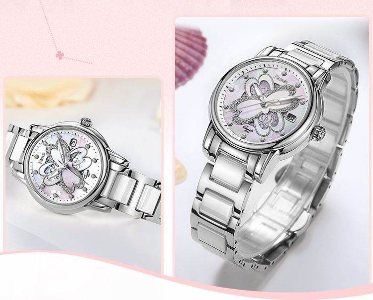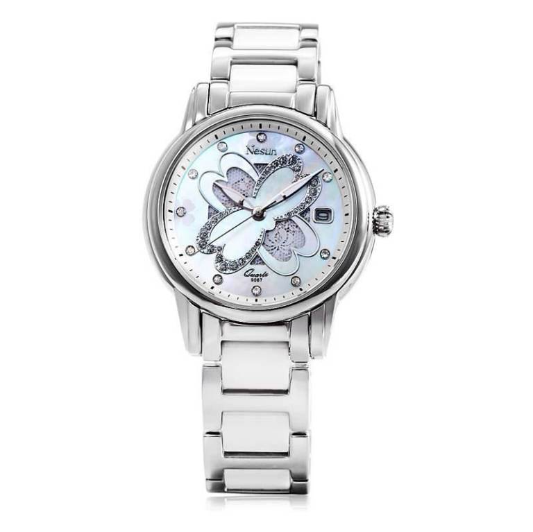 Ladies Luxury Mother of Pearl & Lace Four Leaf Clover, Date, Steel & White Ceramic Bracelet