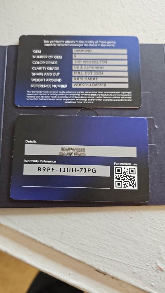 Tapered Stainless Steel bracelet water resistant(300m) .automatic movement with analouge display. Diamond clarity VS1. Never worn . £1750 OVNO