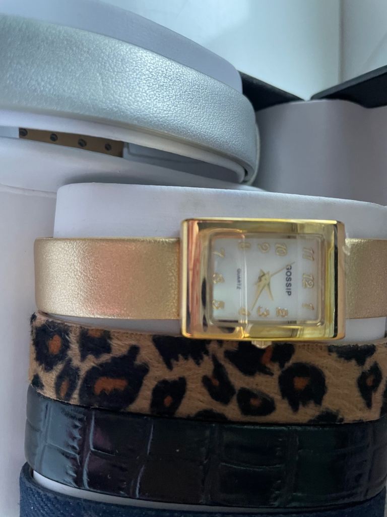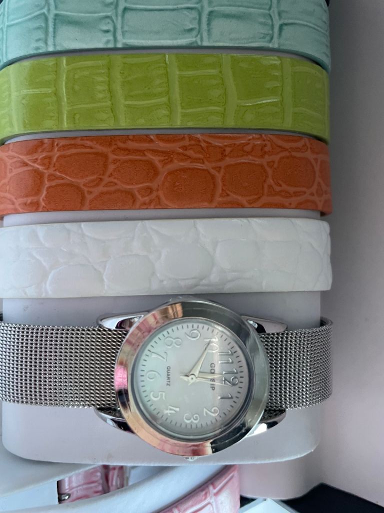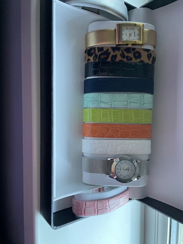 Set with 2 watches, 1 gold tone, 1 silver tone and 11 inter changeable straps, in presentation box. Never used, new batteries fitted. Would make a lovely present.