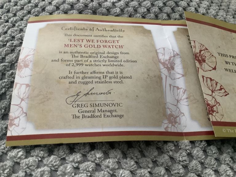 Lest we forget gold watch ,totally unused,certificate of ownership and authenticity,£90phone dave to view.