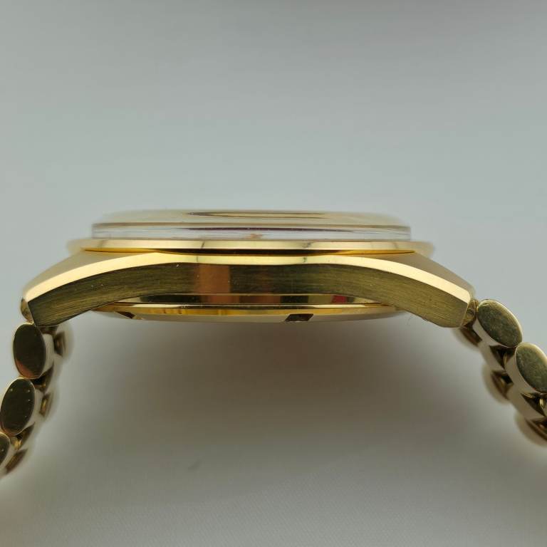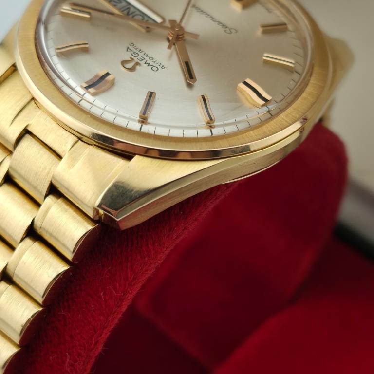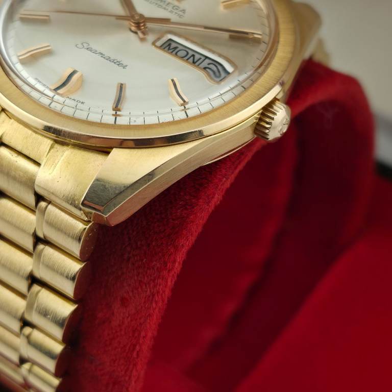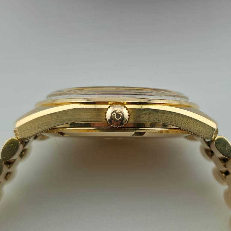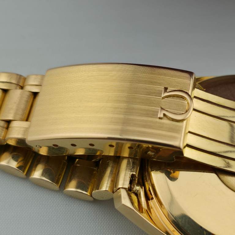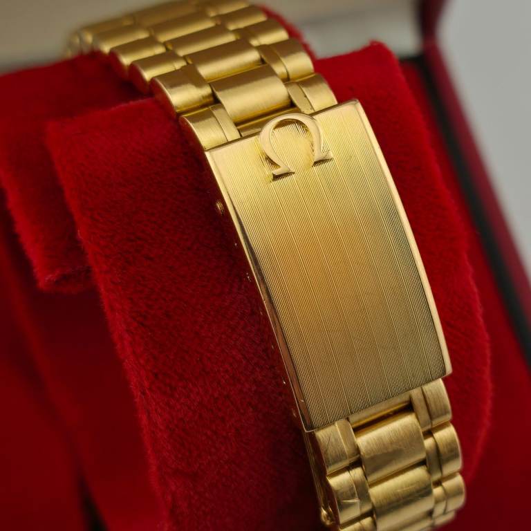 The watch features a stunning dial with onyx hour markers, giving it a refined, high-contrast elegance rarely seen. Adding to its desirability is the extremely scarce Omega reference 1098 solid gold bracelet, which alone is a collector’s item and almost never found paired correctly with this model.