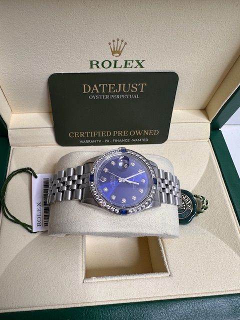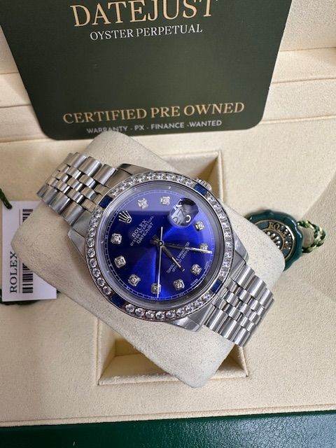 SPECIAL OFFER BEAUTIFUL 36MM DATEJUST WATCH ON A JUBILEE BRACELET AND BLUE DIAL , WITH A CUSTOM STONE BEZEL , CONDITION IS SUPERB COMES WITH BOX ID CARD AND INTERNATIONAL CERTIFICATES , WARRANTY PX POSSIBLE COLLECTION ONLY FROM LEEDS JEWELLERY STORE , FEW WATCHES IN STOCK