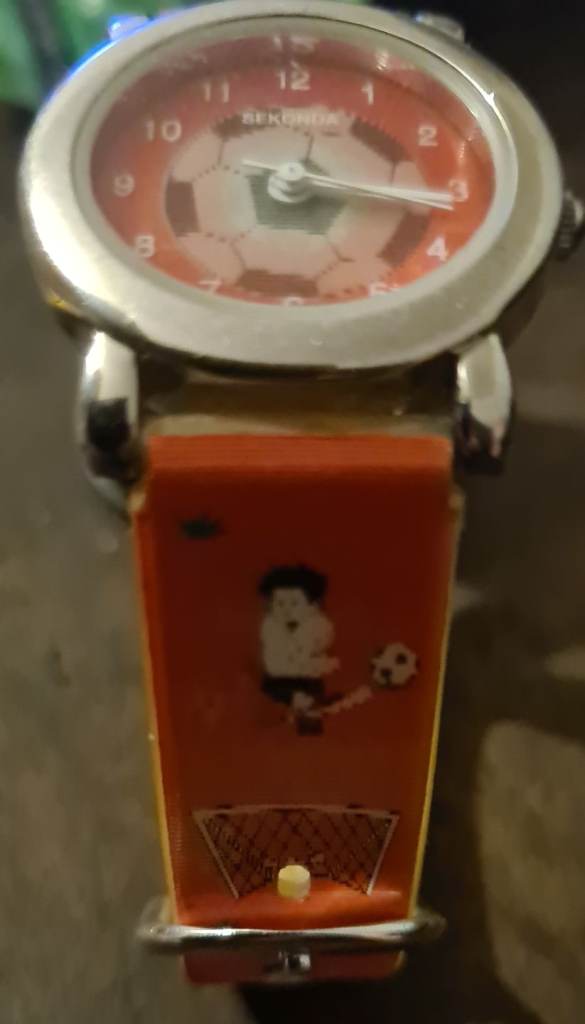 Picture changing footy watch by sekonda the football on the face goes from small to big giving the illusion that the football getting closer to you and the strap goes from someone kicking the ball to it going in the net nice little gimmick for a footy fan. Watch has just had a new battery fitted