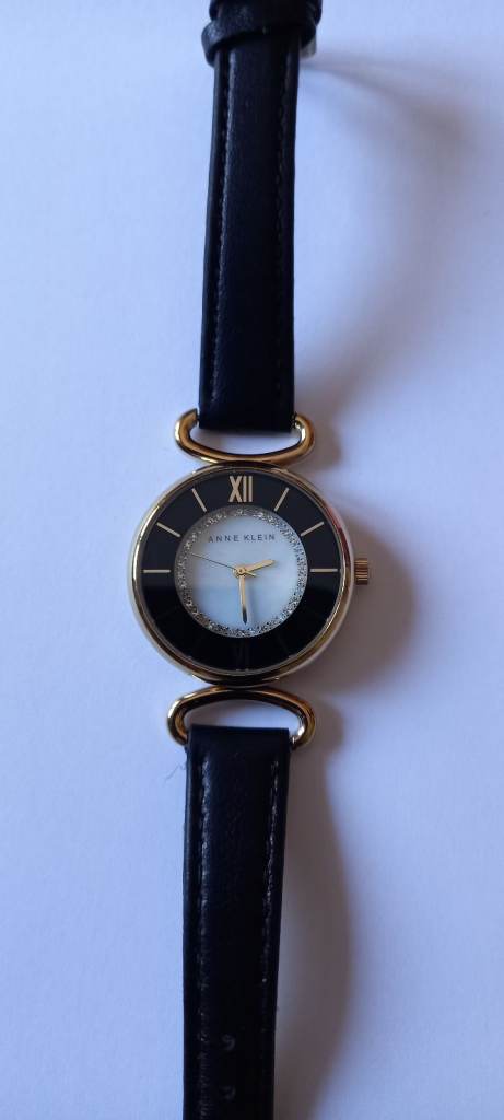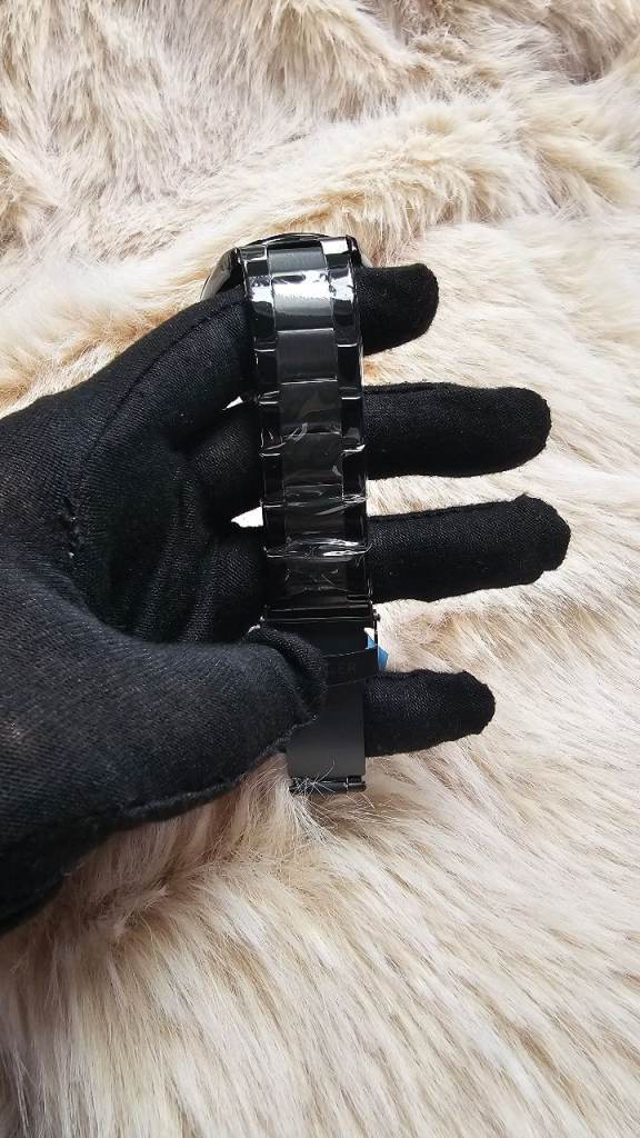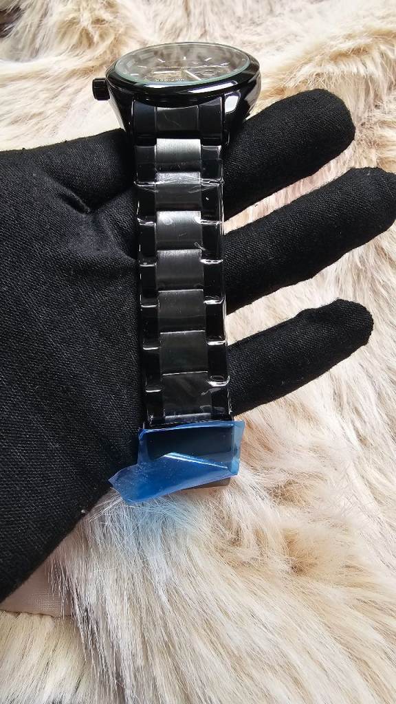 Features a sleek black metal strap and case, still in protective plastic.