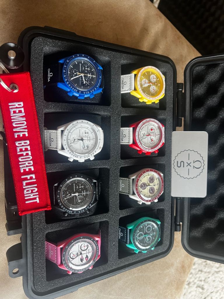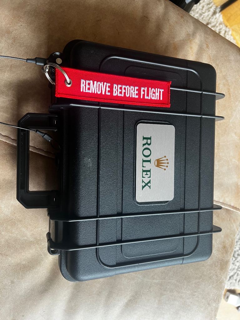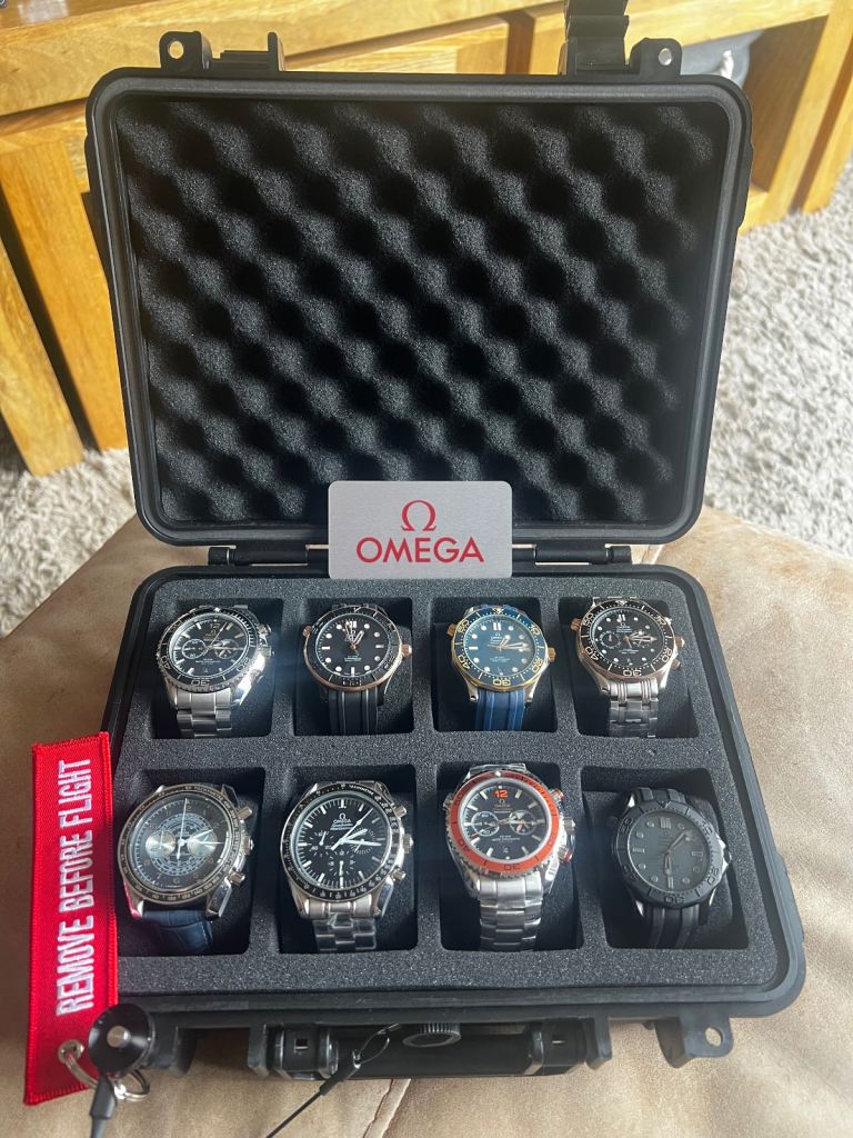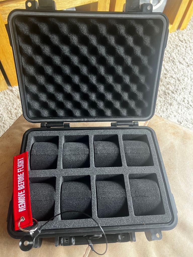 8 slot watch carry case, perfect for secure, waterproof, travel. The carry case is rugged & secure & waterproof to IP67 commercial standards. Comes with foldable case handle, Remove Befire Flight, ball & pin security tag. Steel cord fastening to the case so it’ll never get lost. Foam insert preset cut & set ready for 8 watches.
