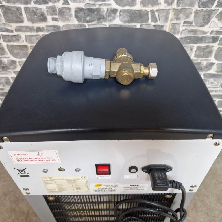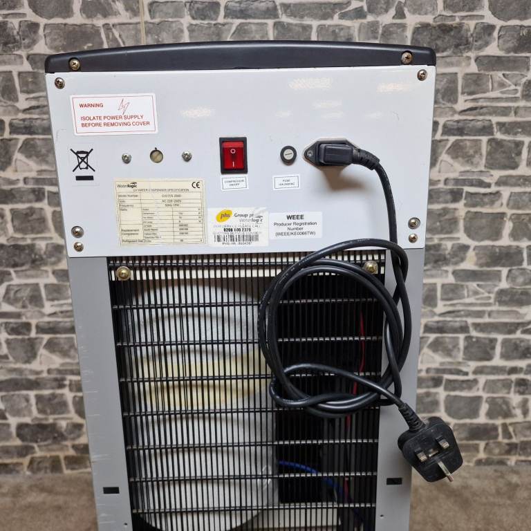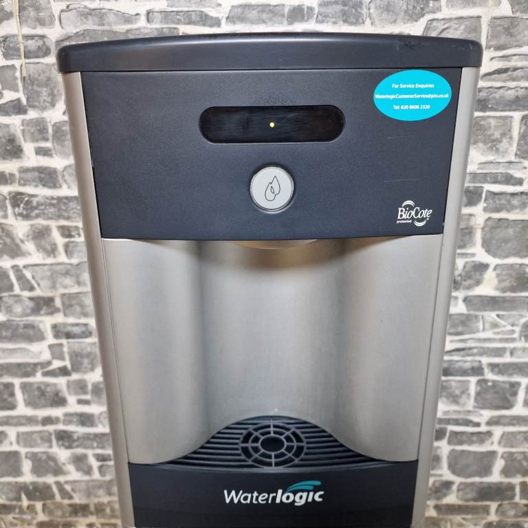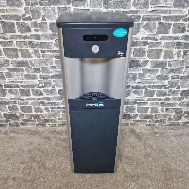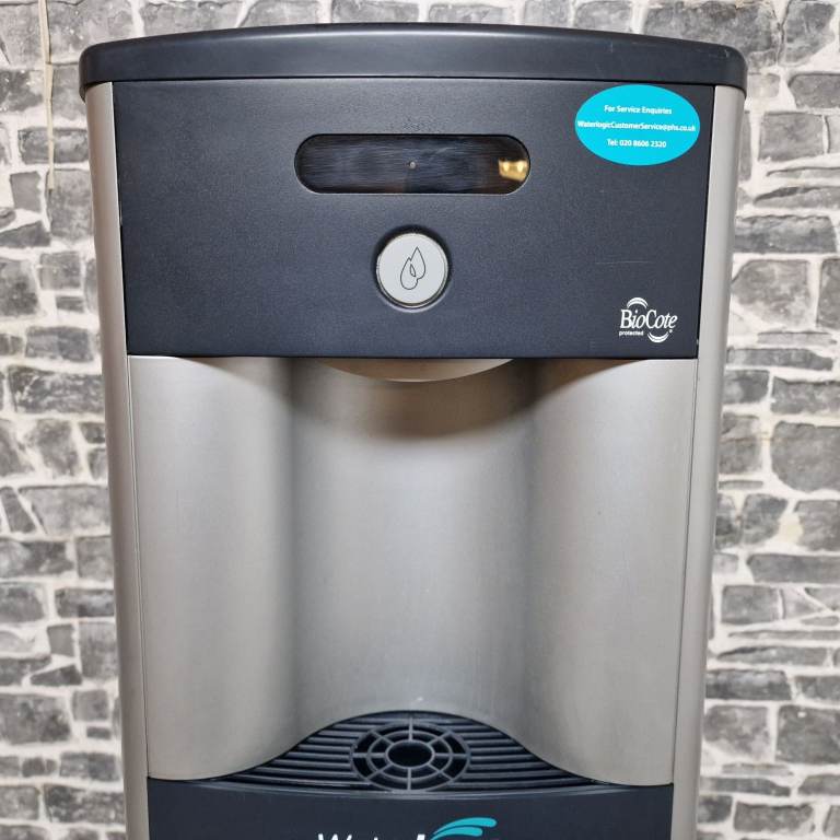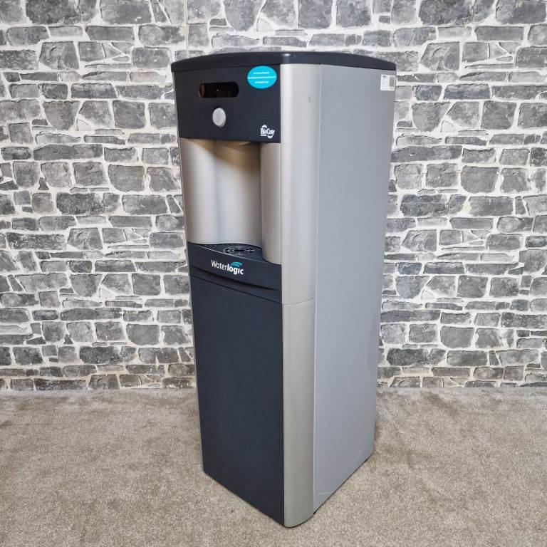 Quality Waterlogic floor-standing plumbed-in water cooler dispenser in good overall condition. Finished in a modern silver and dark grey design, suitable for offices, shops, workshops, or home use. This unit connects directly to the mains water supply, so there is no need for bottles, providing a continuous source of filtered drinking water.