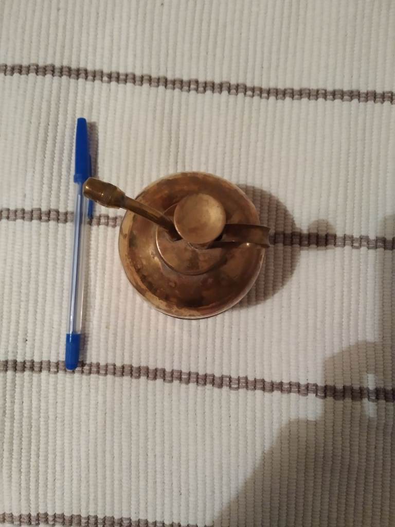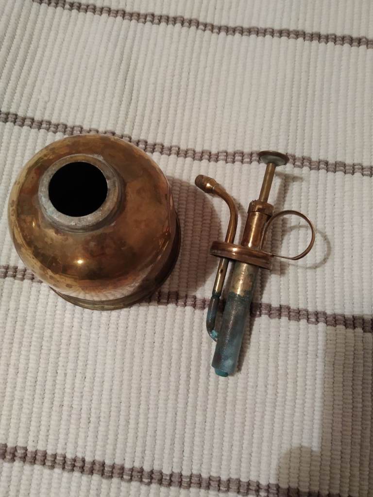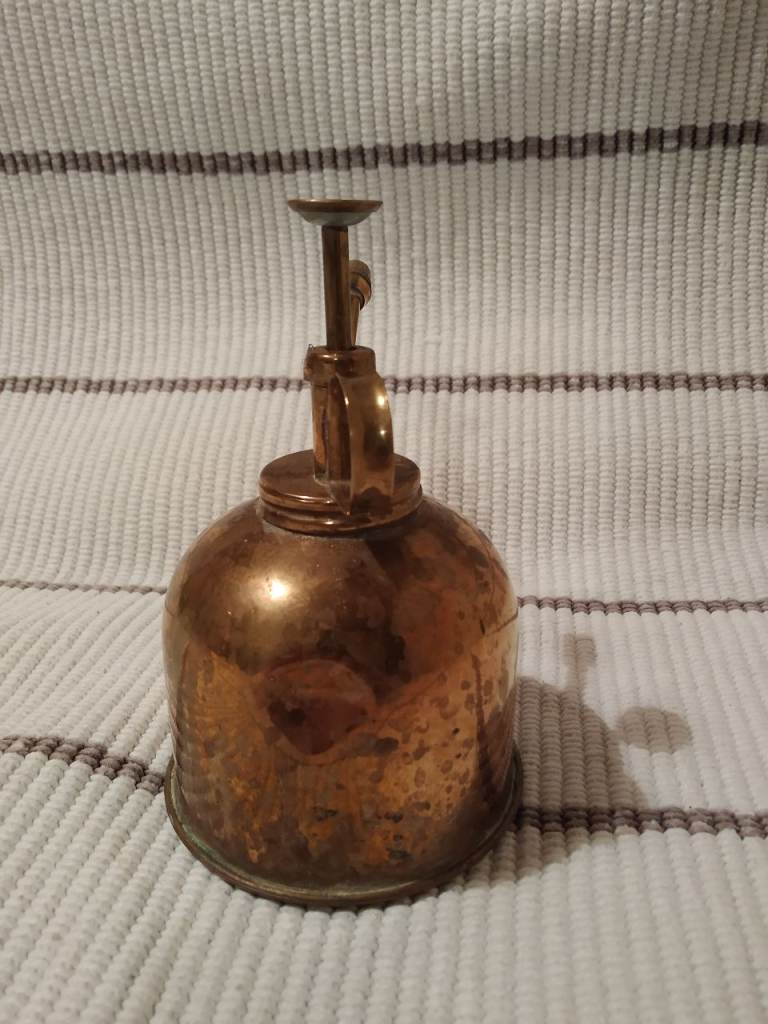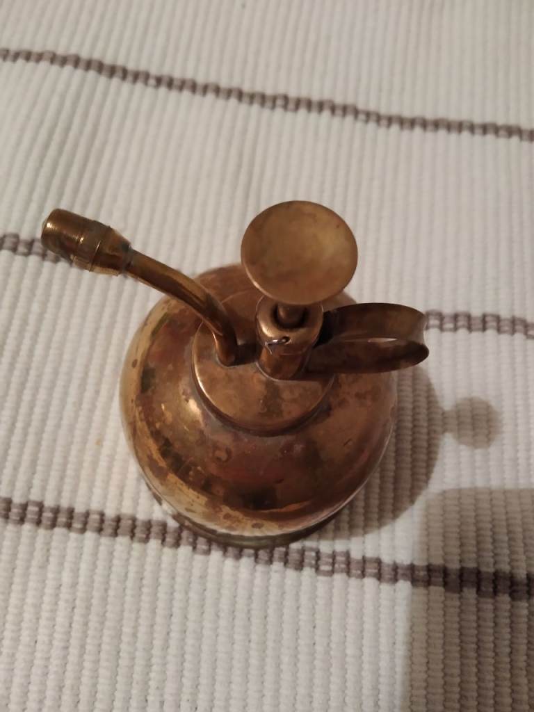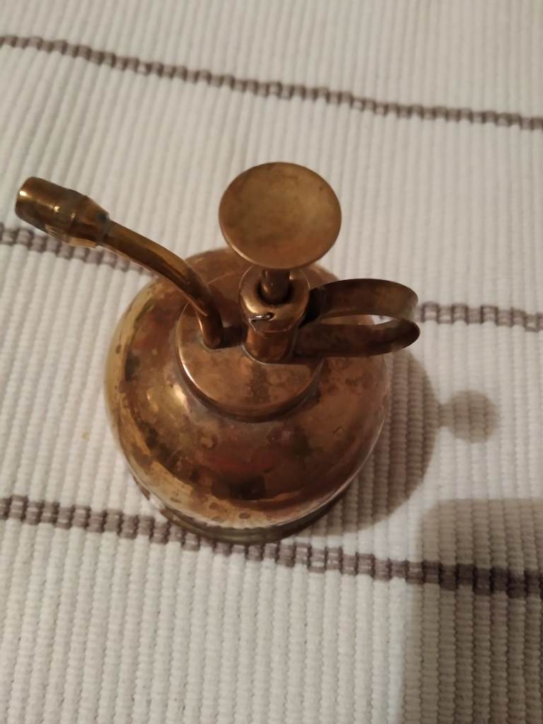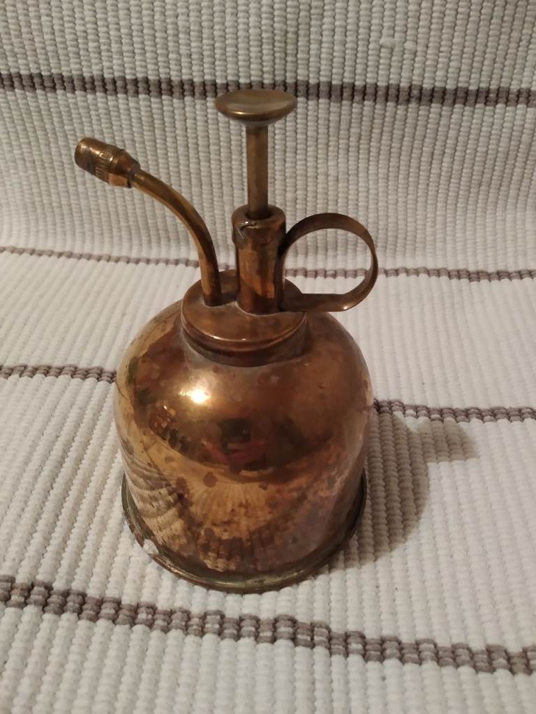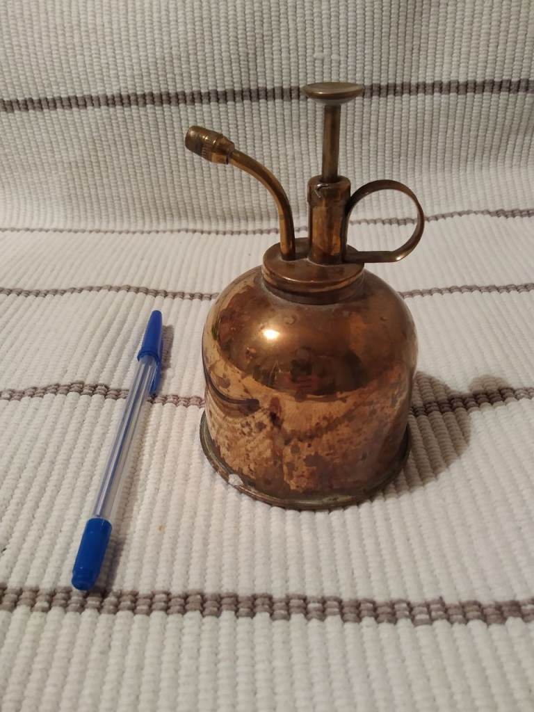 Brass plant sprayer. Works. Needs a little polish for an extra shine. There's a small dent on the side under the handle (see photo) - it doesn't effect functionality.