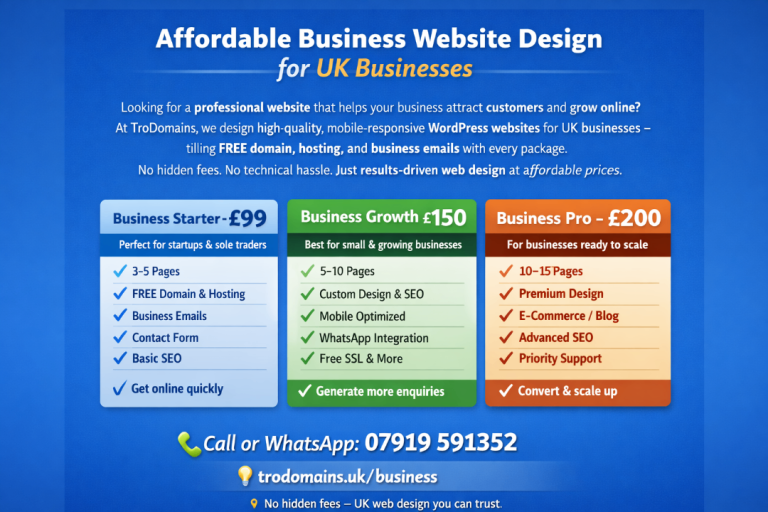 At Trodomains, we design high-quality, mobile-responsive WordPress websites for UK businesses — including FREE domain, hosting, and business emails with every package.