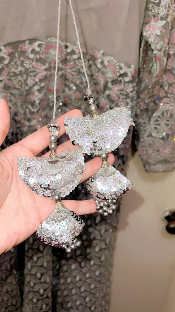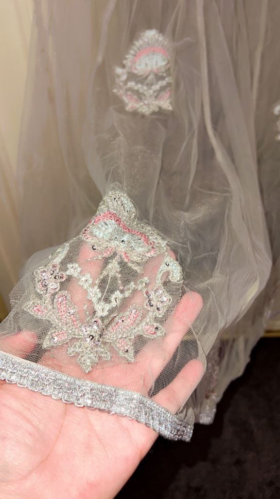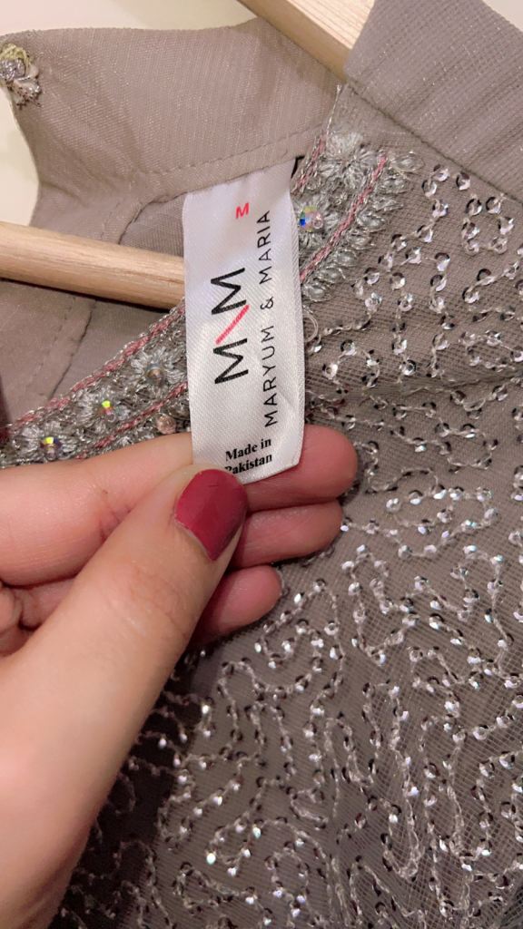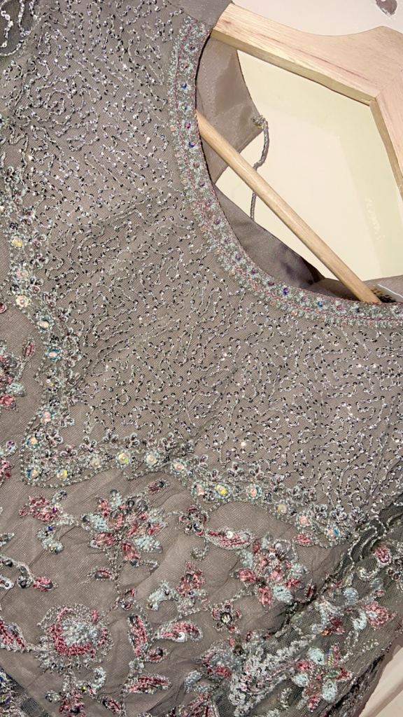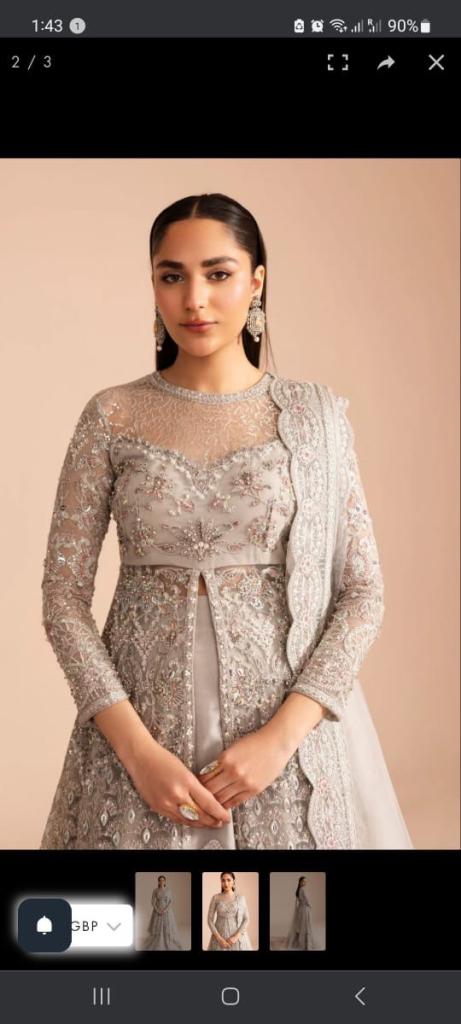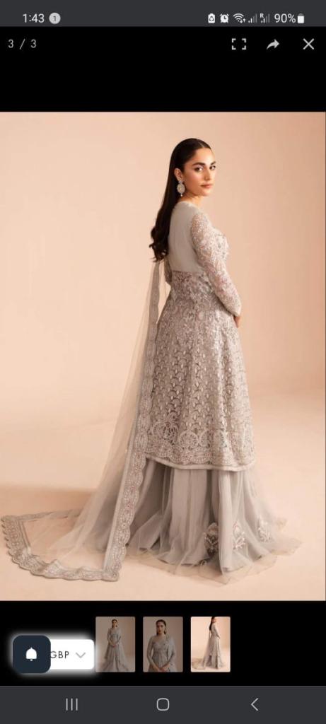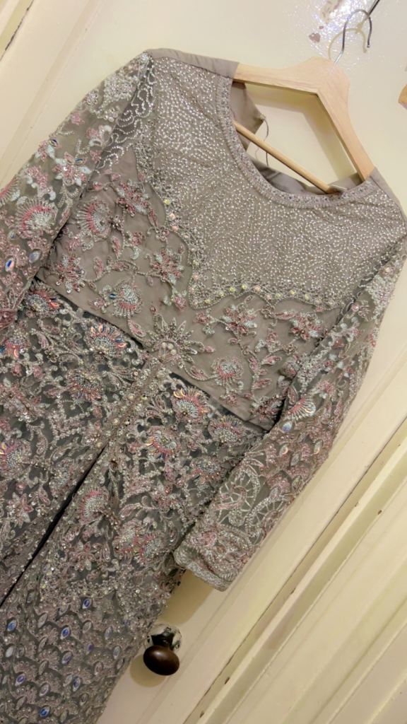 This 3-piece dress by Maryam N Maria is perfect for weddings or parties, with a beautiful silver colour and intricate lace detailing. Made from net material, the dress is designed in UK size 12, catering to a regular fit. The ensemble exudes elegance and sophistication, making it a standout choice for special formal occasions. Perfect for a bride or bridesmaid looking to make a statement at their wedding or party.