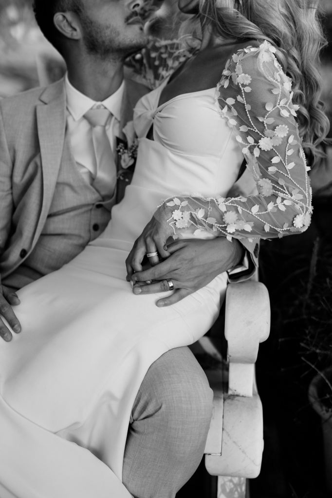 The fabric is an off white silk crepe. It has boning under the bust for support. The 3d embroidered sleeves are absolutely beautiful. It has a scoop back with button up detail, it hugs you in at the bum, but then flares out so you can move easily in it.