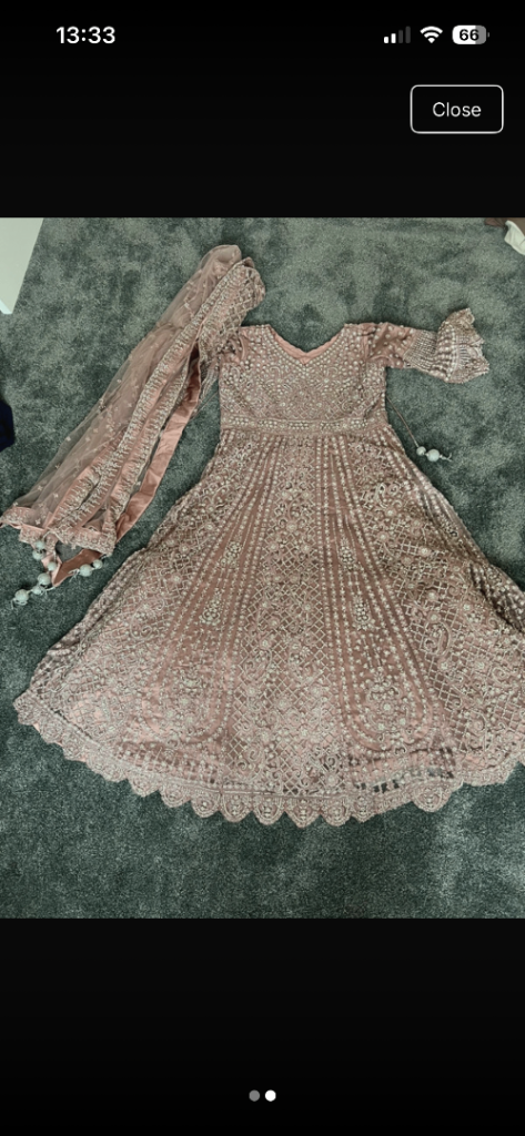 Soft pink dress it’s so heavy am beautiful the pictures don’t do it justice I paid £480 for this dress an worn it for 2 hrs maximum the scarf is stunning also it’s a size L (44-46) looking for £150 or offers around that price