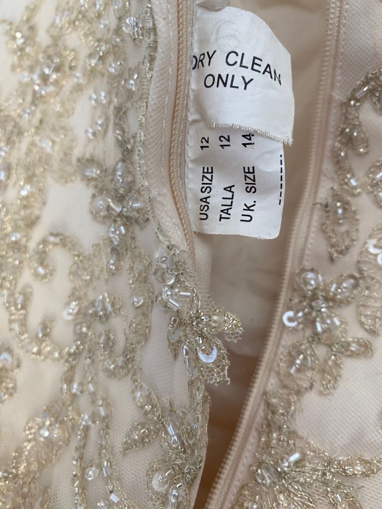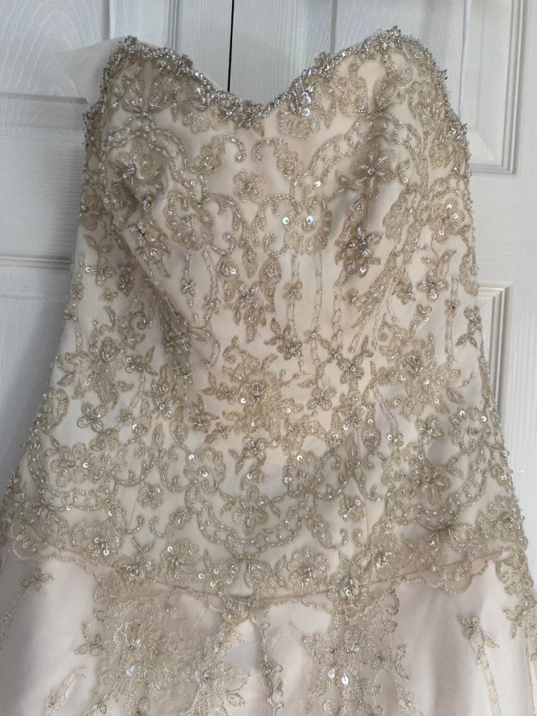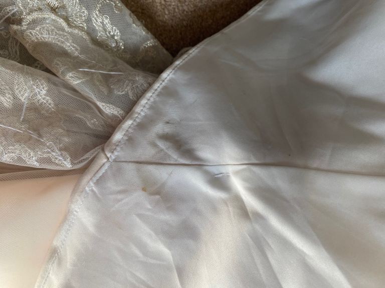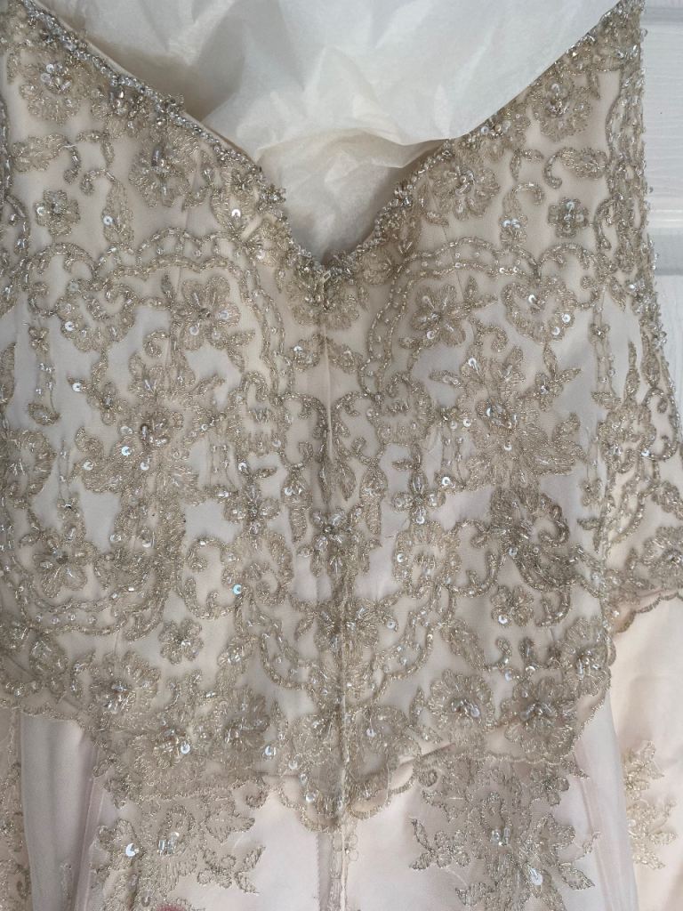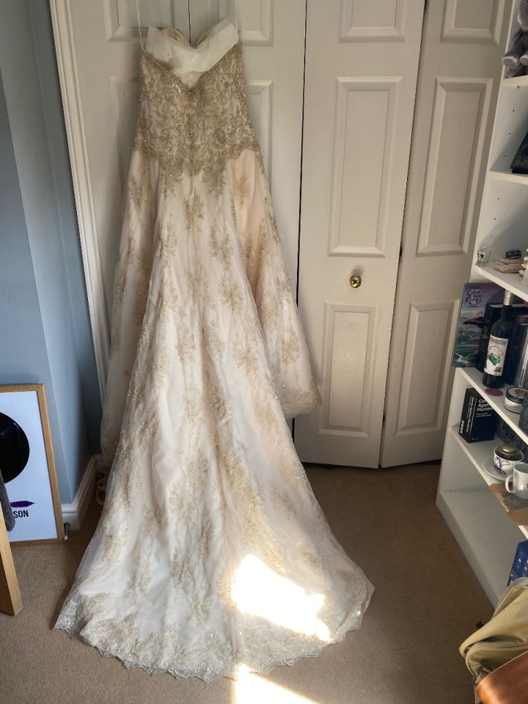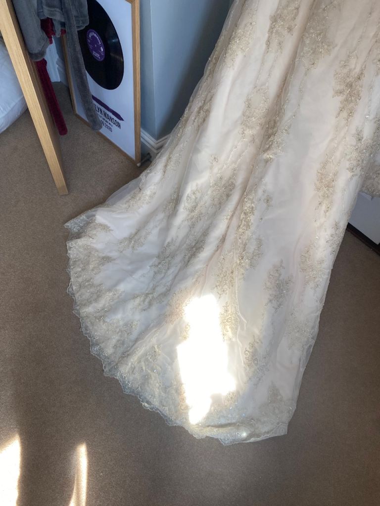 Cream wedding dress size 14 will need dry cleaning as some marks on the bottom train as shown in picture also the hook on the back would need fixing but nothing a seamstress couldn’t sort easily