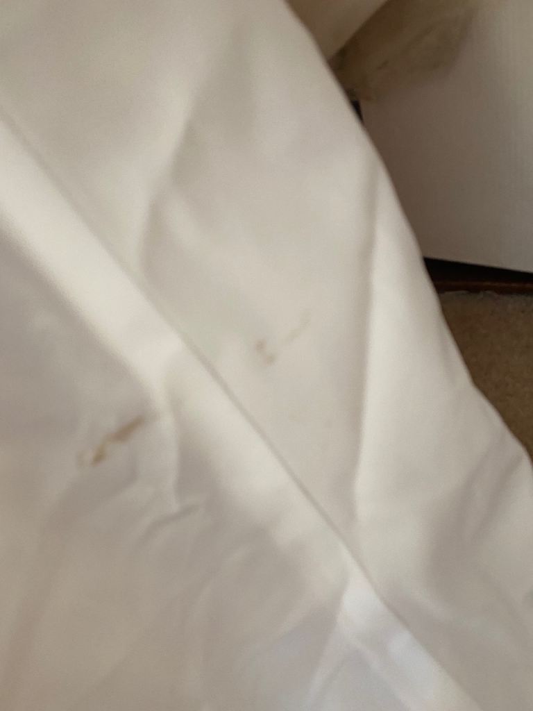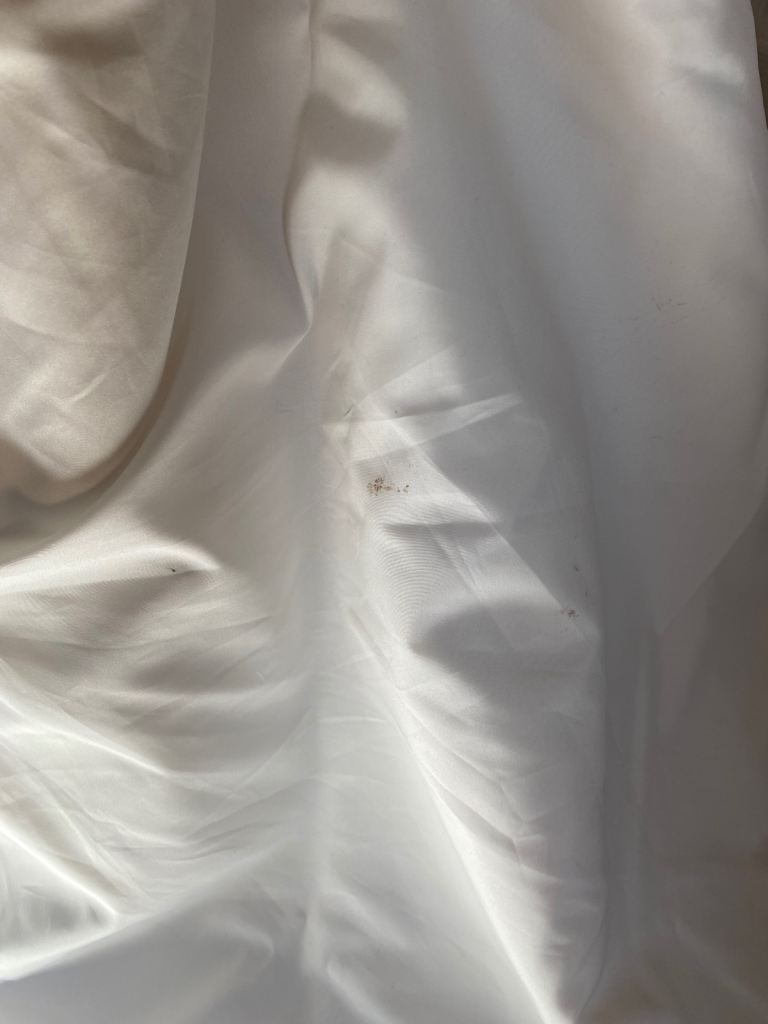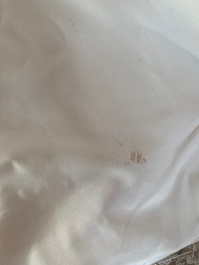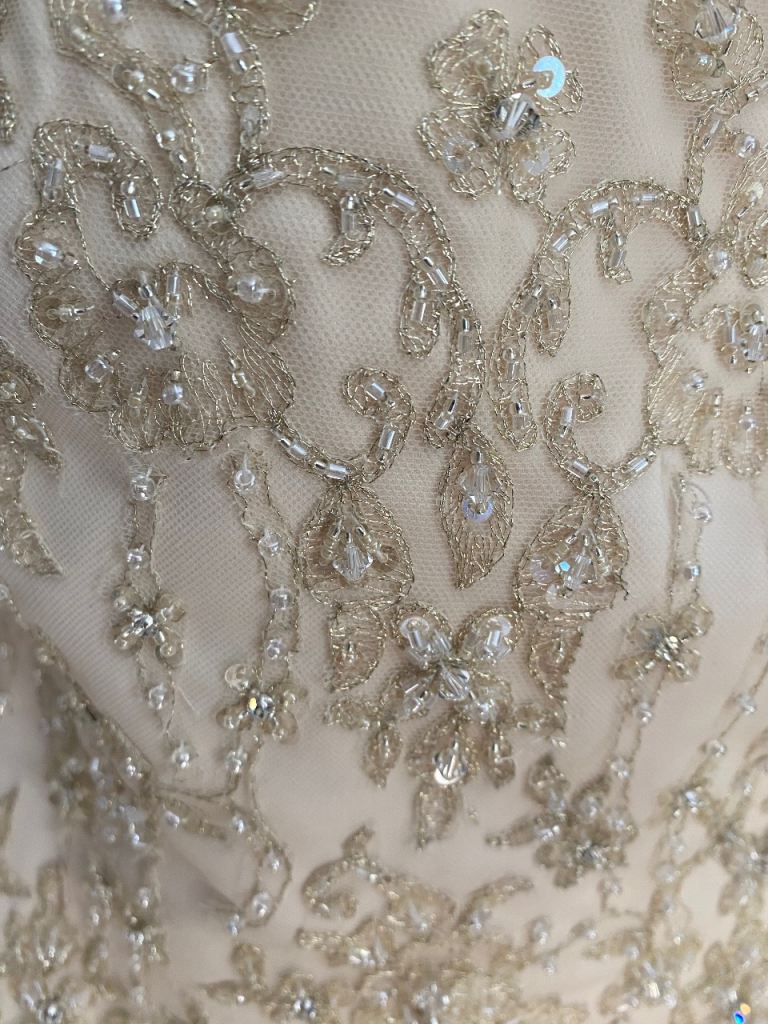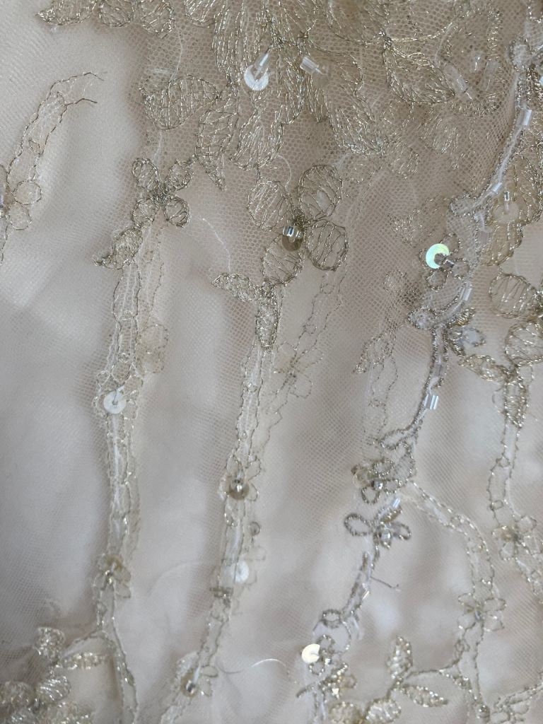 Cream wedding dress size 14 will need dry cleaning as some marks on the bottom train as shown in picture also the hook on the back would need fixing but nothing a seamstress couldn’t sort easily