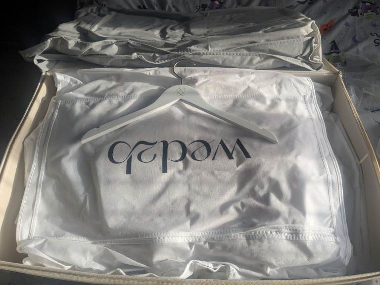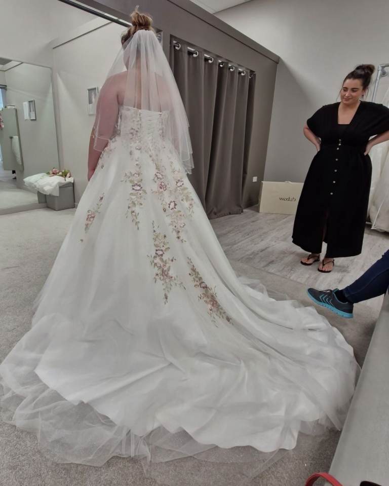 Beautiful ivory, floral patterned wedding dress. Floor length. Flowers up the back of the dress, glittery top layer to the dress also. Feel free to ask for other photos.