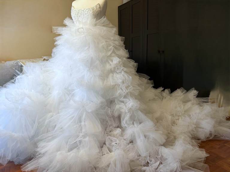 The skirt of the dress is voluminous and ruffled and has a long hem with a train.