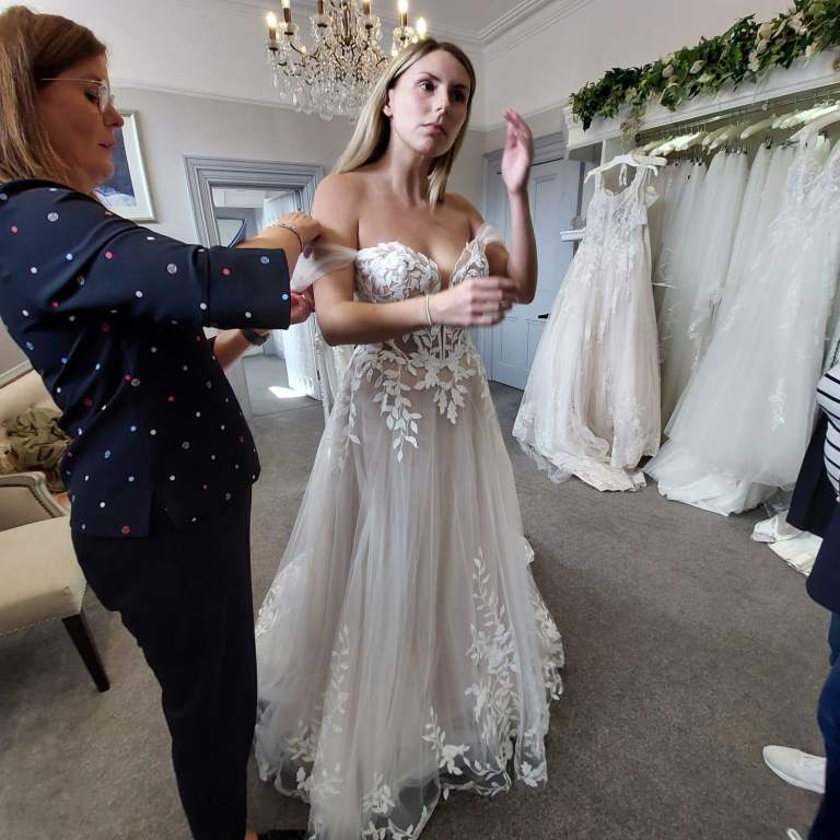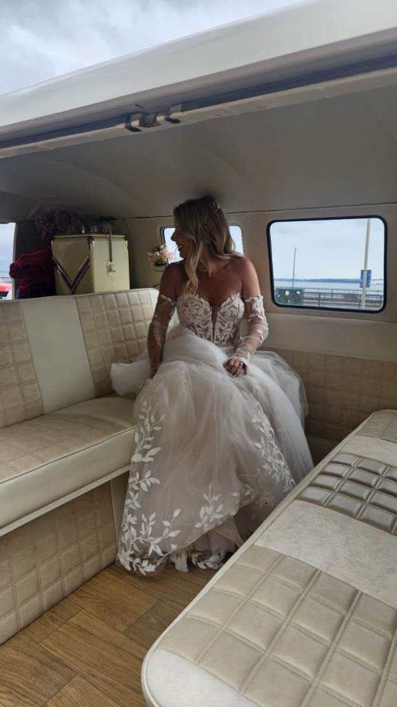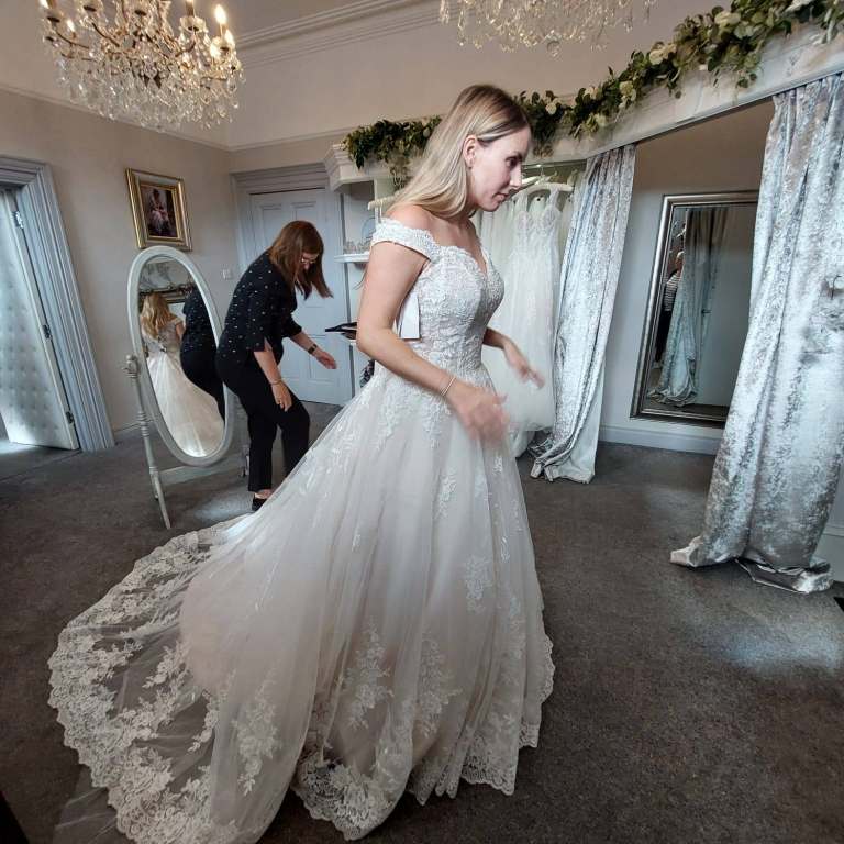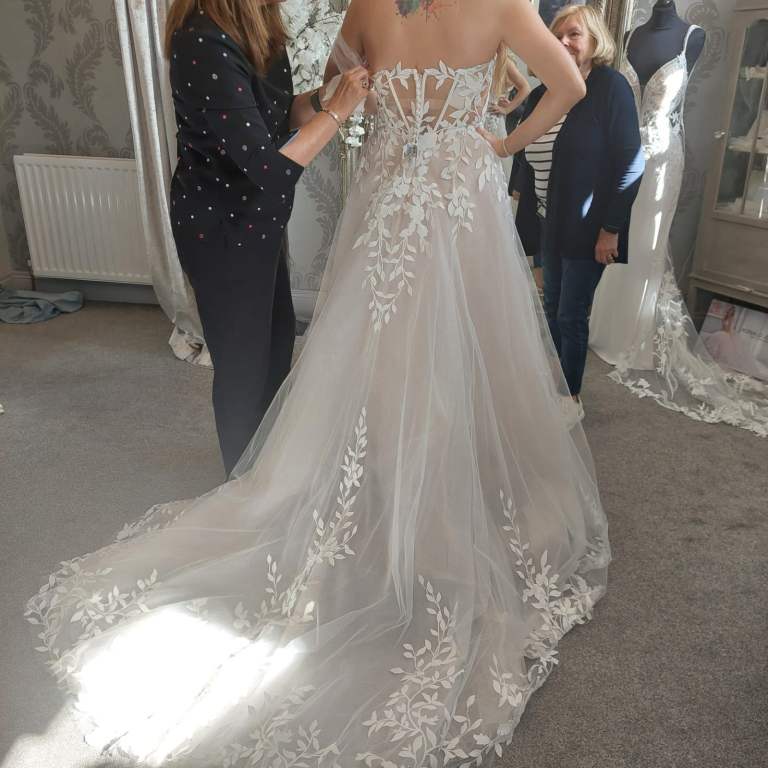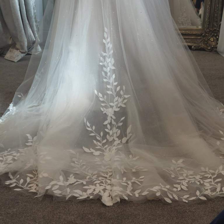 Bought new , worn once. Will be fully and professionally cleaned before shipping . Wedding dress with detachable off the shoulder straps. The designer is Enzoani, fitted to a size 10. Custom made matching sleeves and long veil.