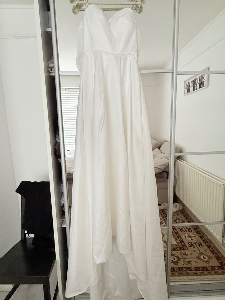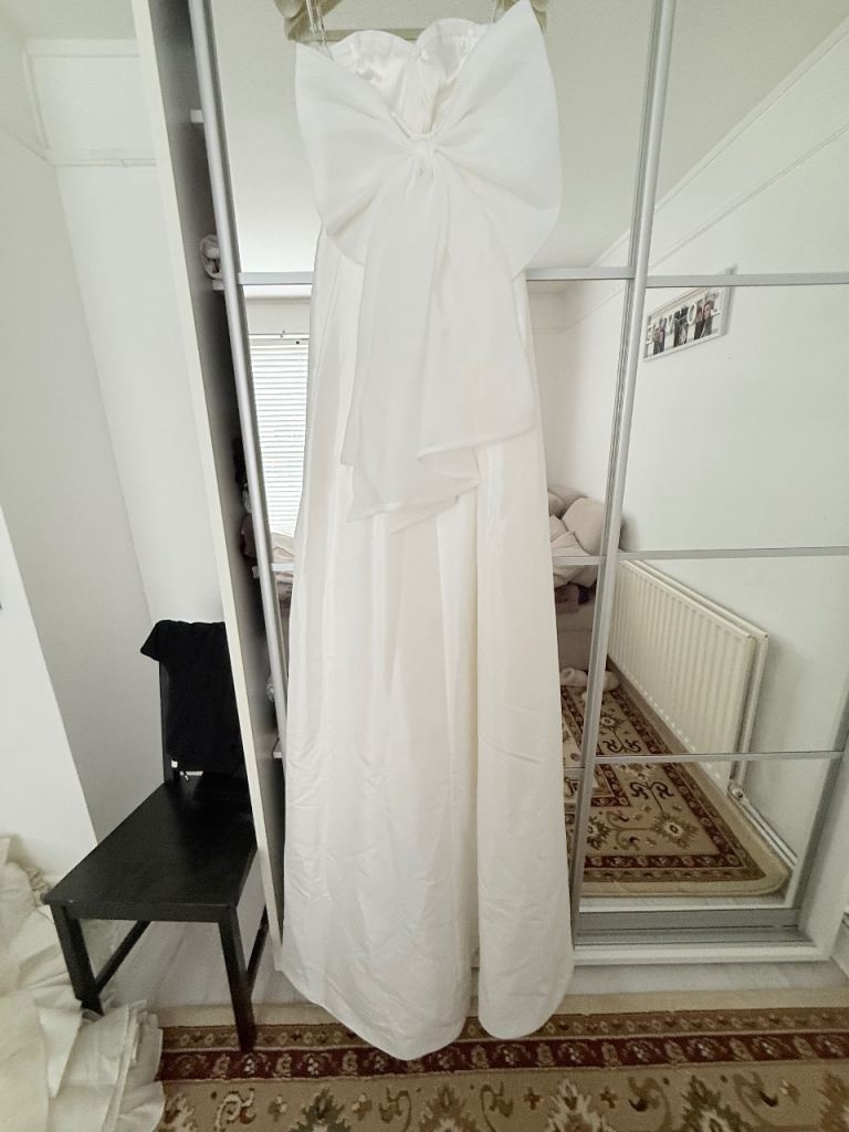Strapless sweetheart neckline with a stunning oversized bow detail. Perfect for wedding/civil ceremony.