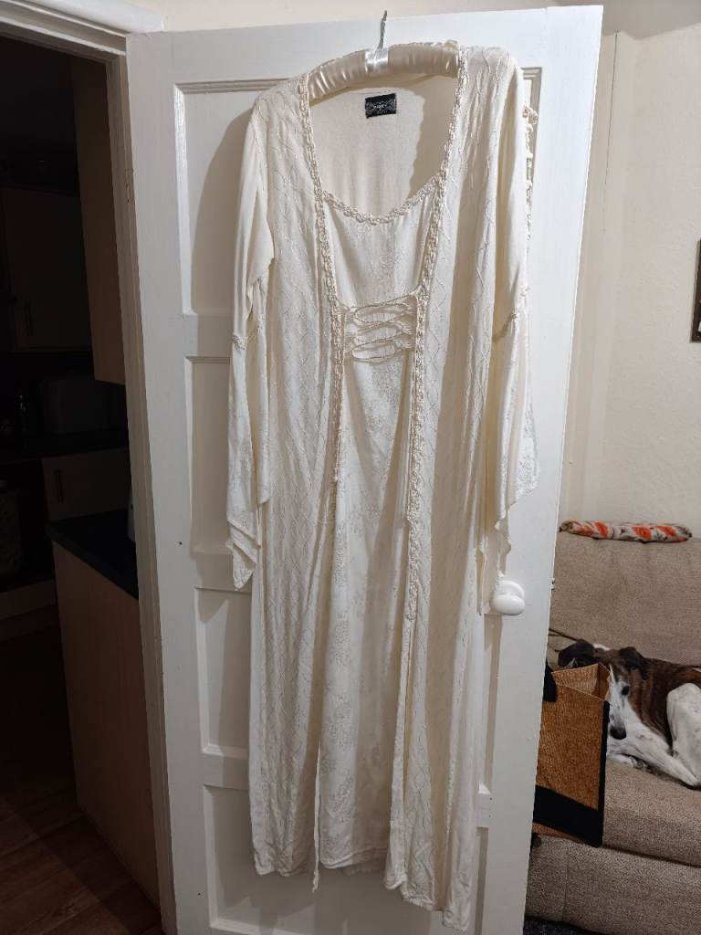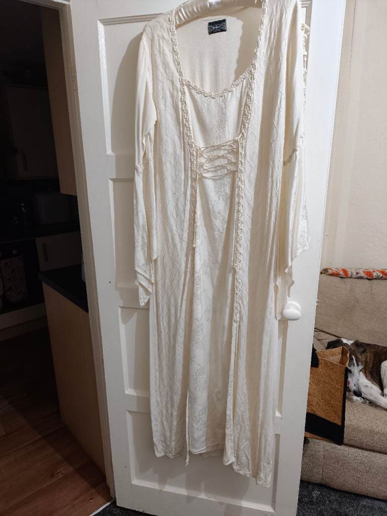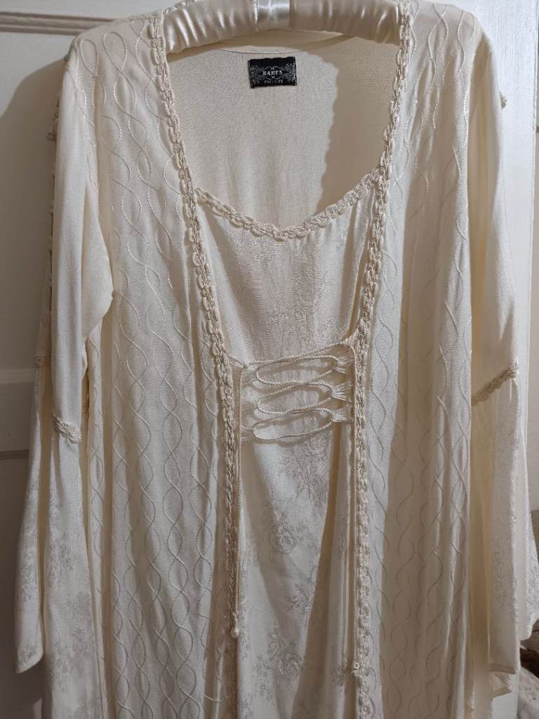 Beautiful vintage style wedding dress with wide draped sleeves, flower design with tie front, 2 slits at the front, 💯 viscose (Breathable, Lightweight) it's a free size.