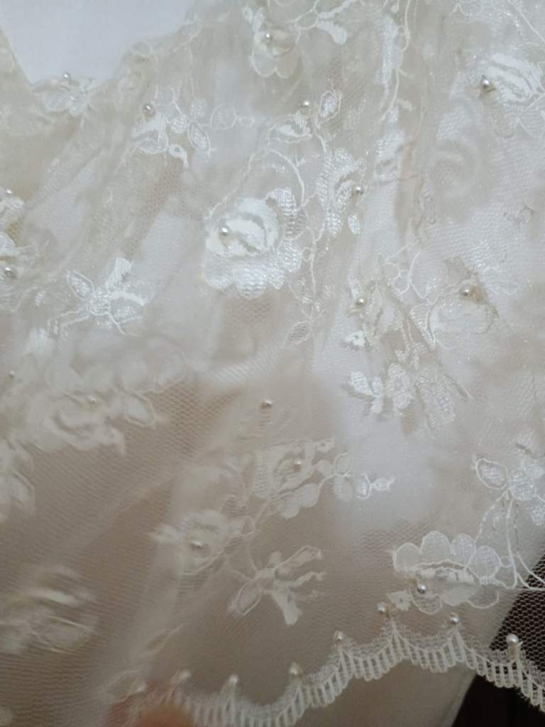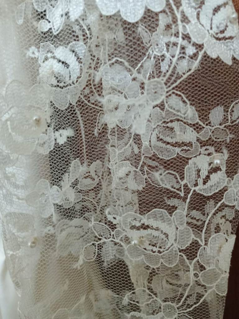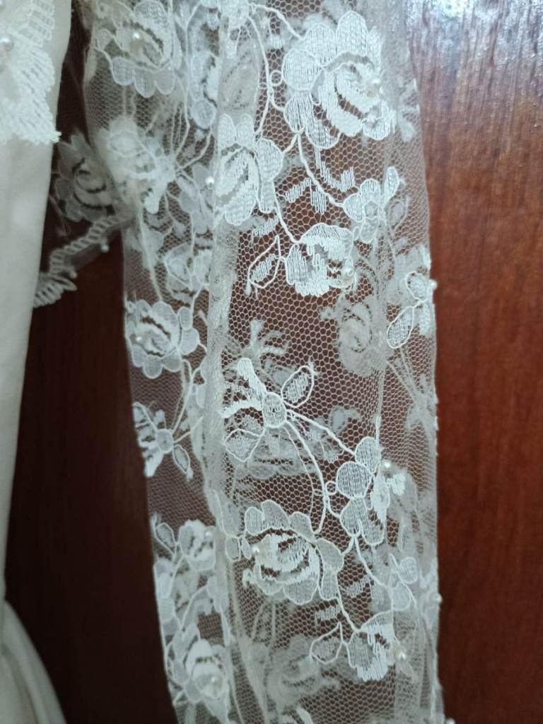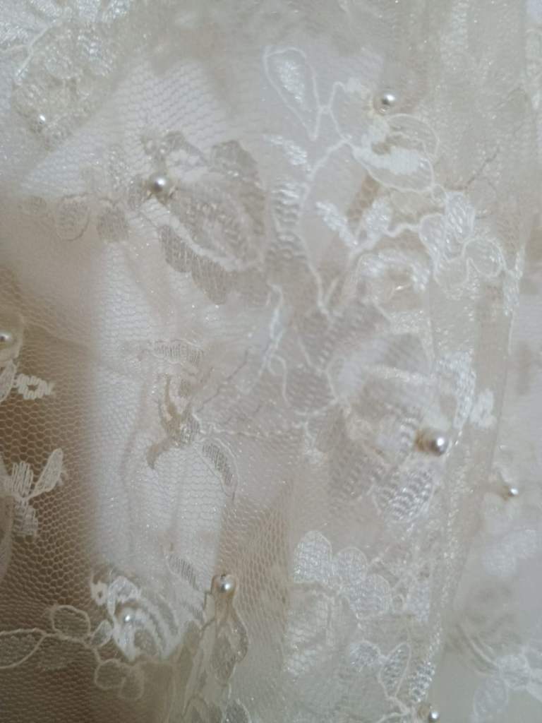 Professionally made by seamstress. Ivory wedding dress with hand sewn pearls on the lace Complete with veil and flowers also an under petticoat .Suitable for 5 ft 6 ins lady.Buyer collects BD23DG Eccleshill no offers or time wasters thanks