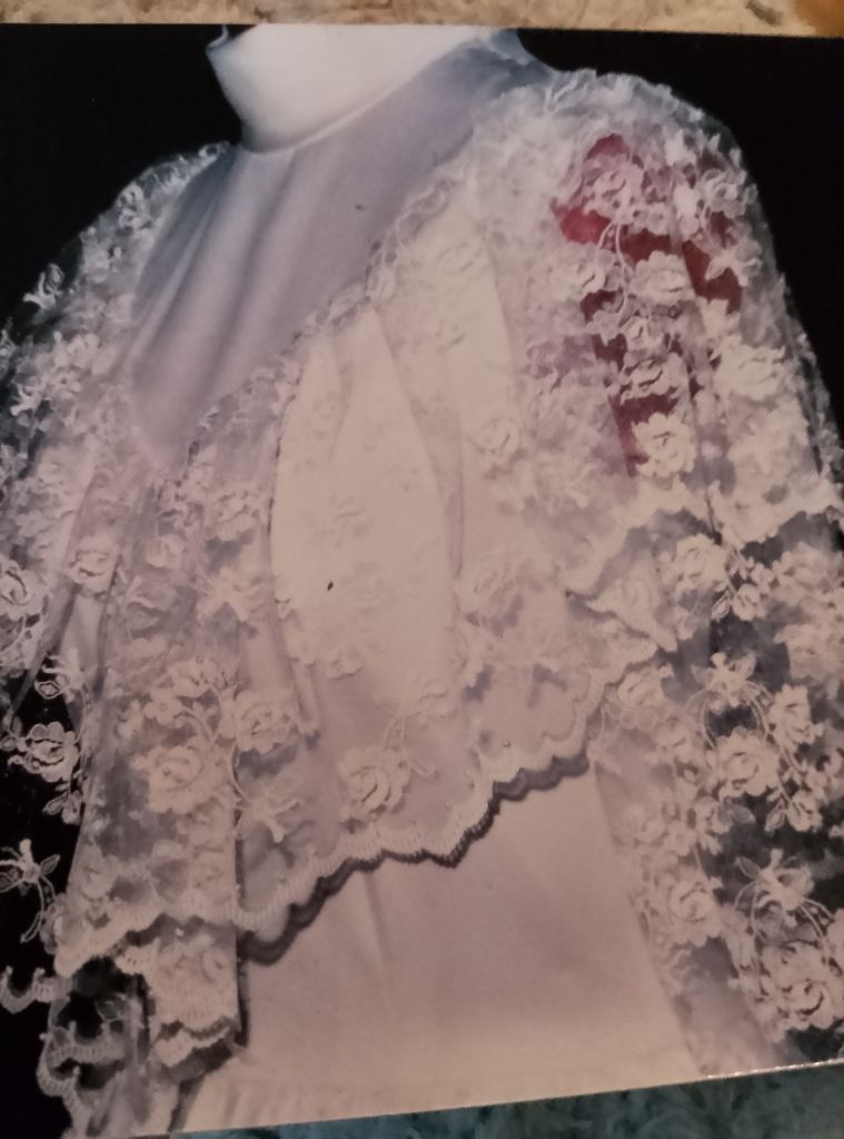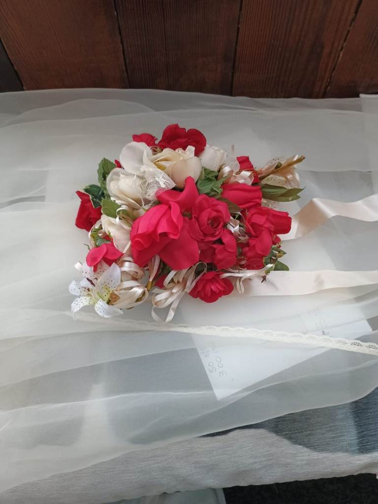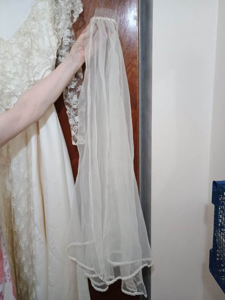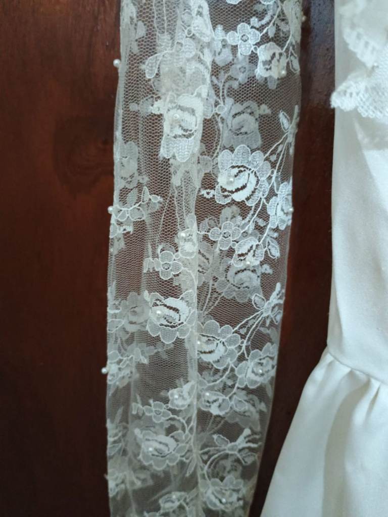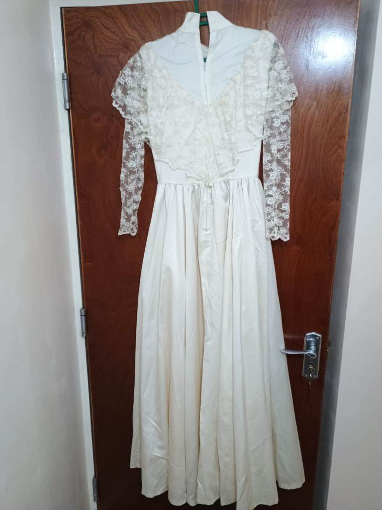 Professionally made by seamstress. Ivory wedding dress with hand sewn pearls on the lace Complete with veil and flowers also an under petticoat .Suitable for 5 ft 6 ins lady.Buyer collects BD23DG Eccleshill no offers or time wasters thanks