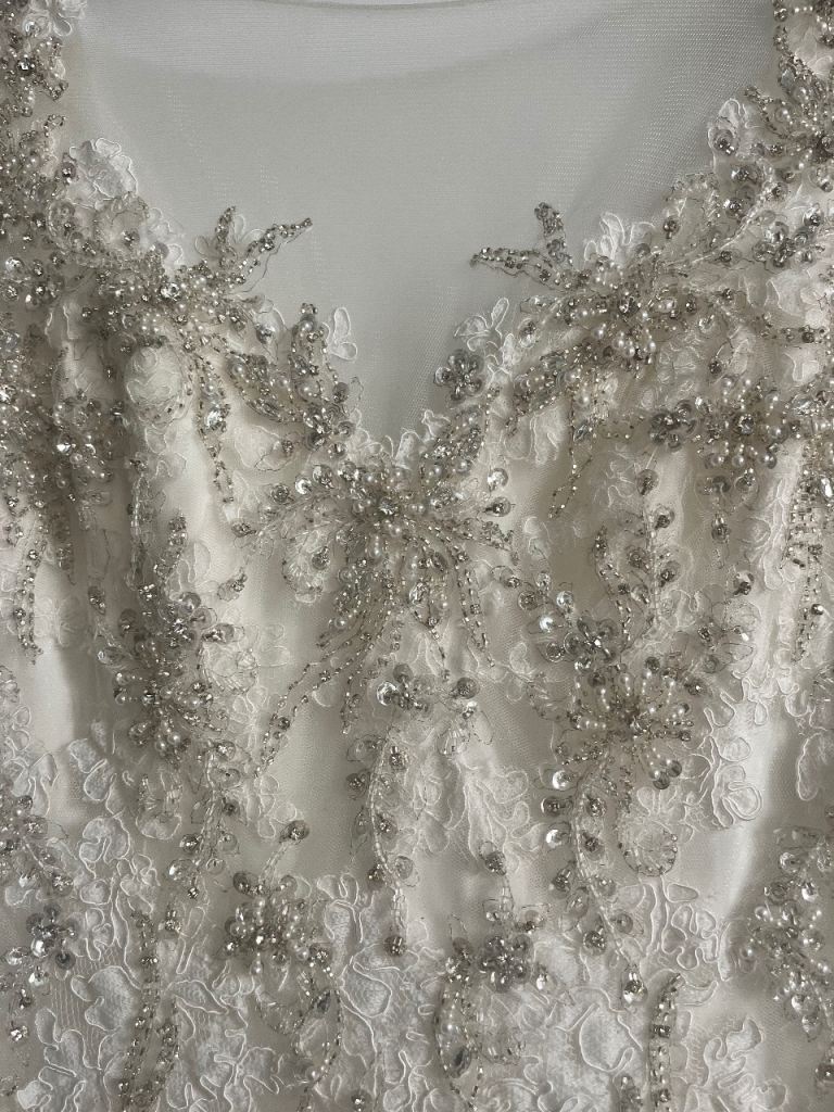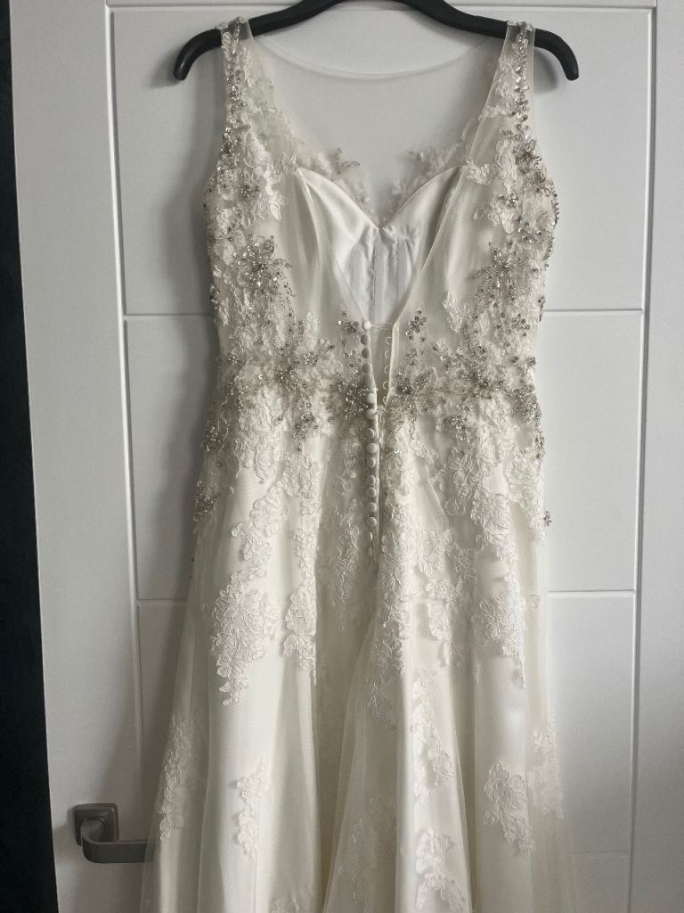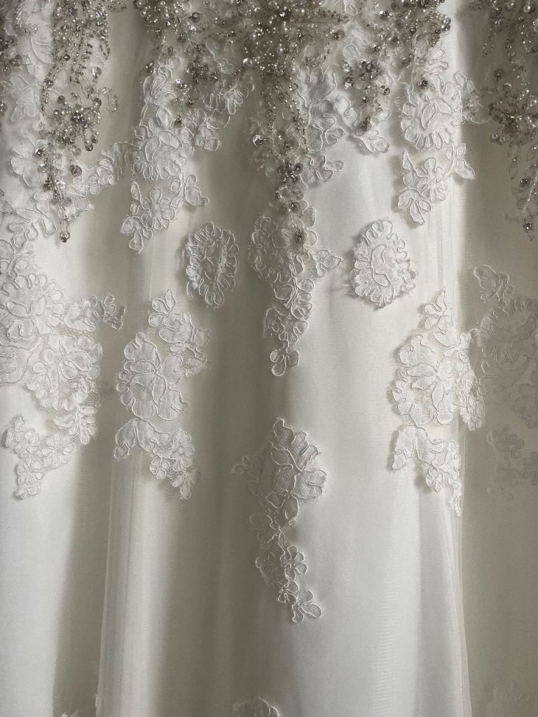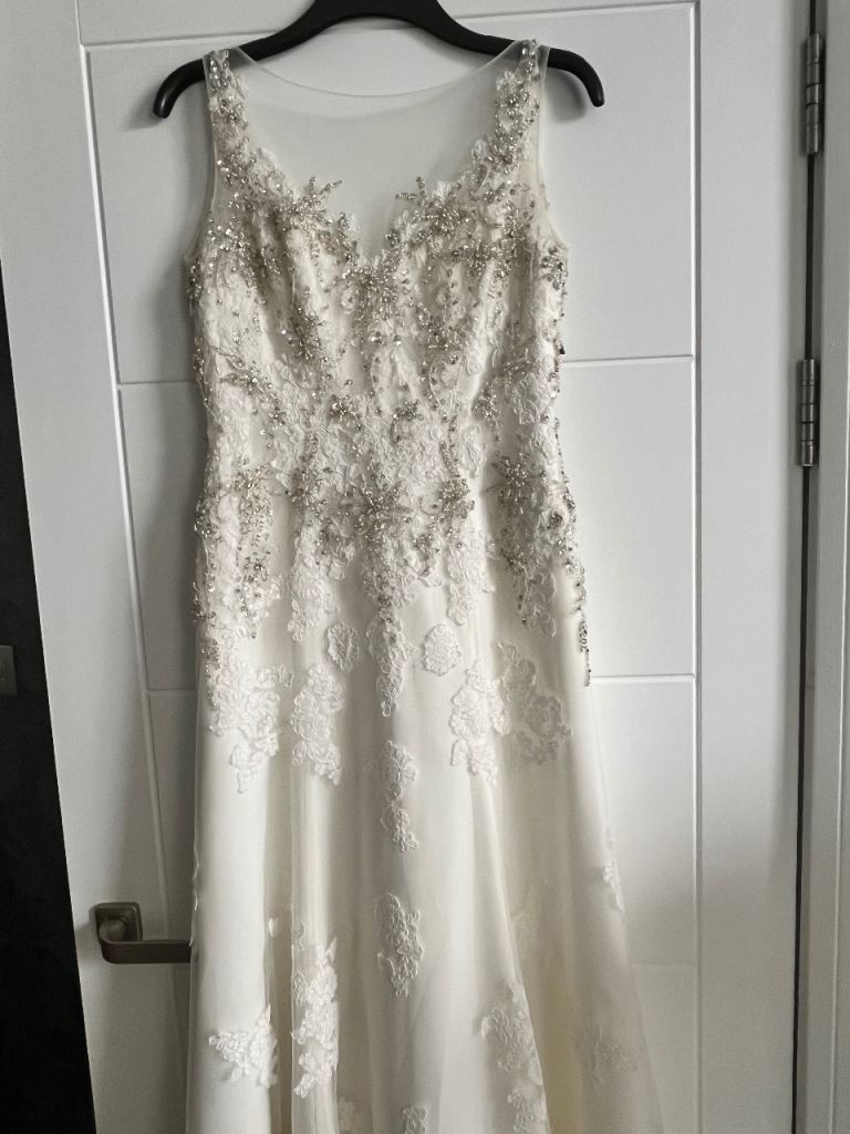Morilee wedding dress stunning design embellished with stones and pearls. Very flattering on with fitted bodice which is low cut in the front and backless. Needs to be seen to be appreciated. UK size 12